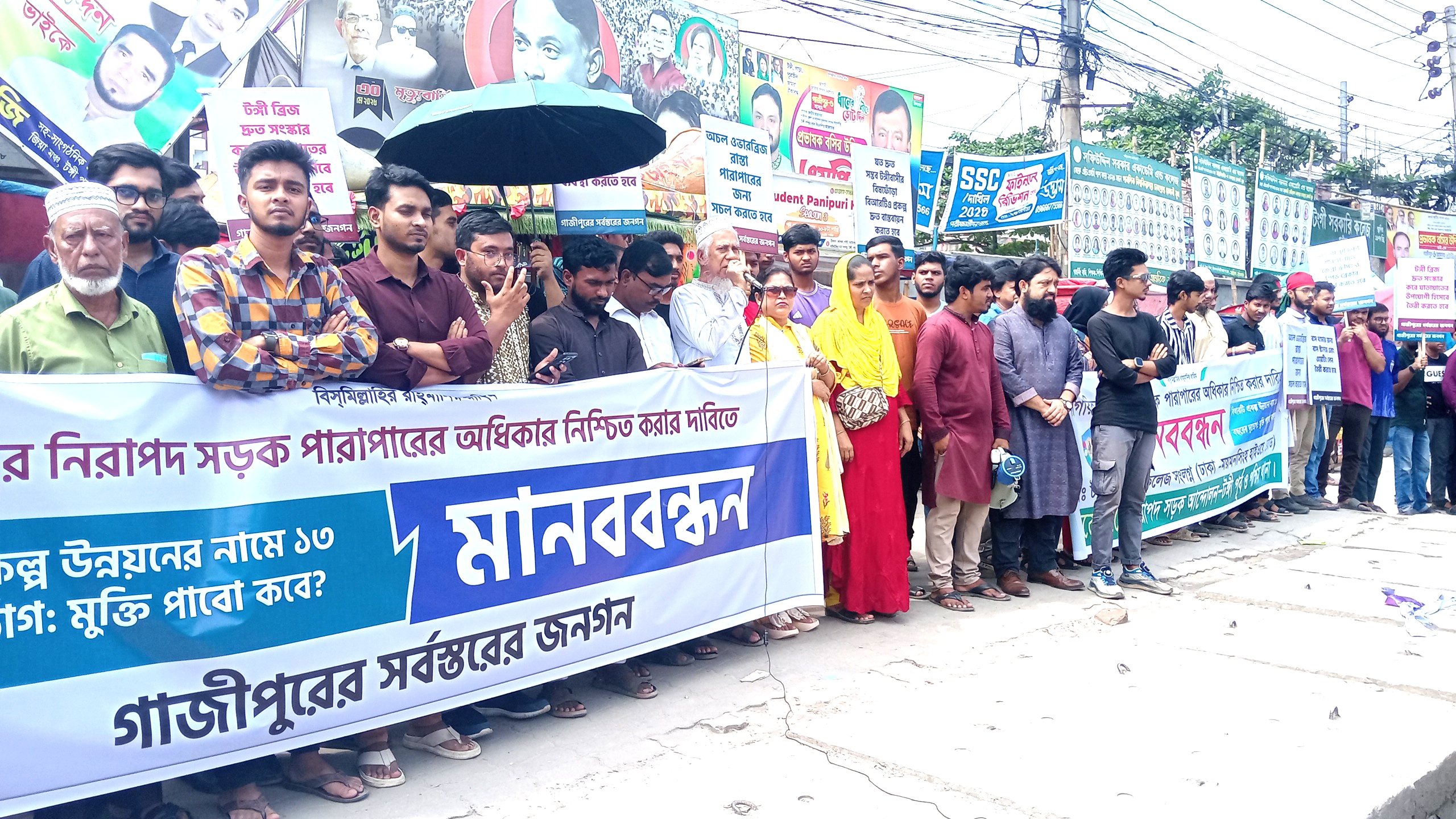 নিজস্ব প্রতিবেদক : নাগরিকদের নিরাপদ সড়ক পারাপারের অধিকার নিশ্চিত ও দীর্ঘদিনের বি.আর.টি প্রকল্পের ভোগান্তি থেকে মুক্তির দাবিতে টঙ্গীতে মানববন্ধন অনুষ্ঠিত হয়েছে। সোমবার (৬ অক্টোবর) বেলা সাড়ে ১১টার দিকে টঙ্গী সরকারি কলেজ সংলগ্ন ঢাকা–ময়মনসিংহ মহাসড়কে এ মানববন্ধন অনুষ্ঠিত হয়। গাজীপুরের সর্বস্তরের নাগরিকদের ব্যানারে আয়োজিত মানববন্ধনে ছোট ছোট প্ল্যাকার্ডে লেখা ছিল টঙ্গীবাসীর বিষফোঁড়া বি.আর.টি প্রকল্প দ্রুত বাস্তবায়ন করতে হবে, ঝুঁকিপূর্ণ ক্রসিংগুলোতে স্পিড ব্রেকার নির্মাণ, ওভারব্রিজে বৃদ্ধ ও প্রতিবন্ধীদের জন্য এস্কেলেটর দাও, এবং ১৩ বছরের দুঃখের অবসান চাই। বক্তারা বলেন, নিরাপদ সড়ক পারাপার নাগরিকের মৌলিক অধিকার। ১৩ বছর ধরে বি.আর.টি প্রকল্প উন্নয়নের নামে টঙ্গীবাসী সীমাহীন দুর্ভোগে রয়েছে। অবিলম্বে এ প্রকল্পের কাজ শেষ করে চলাচলের নিরাপত্তা নিশ্চিত করতে হবে। এসময় নাগরিকদের নয় দফা দাবি উল্লেখ করেন