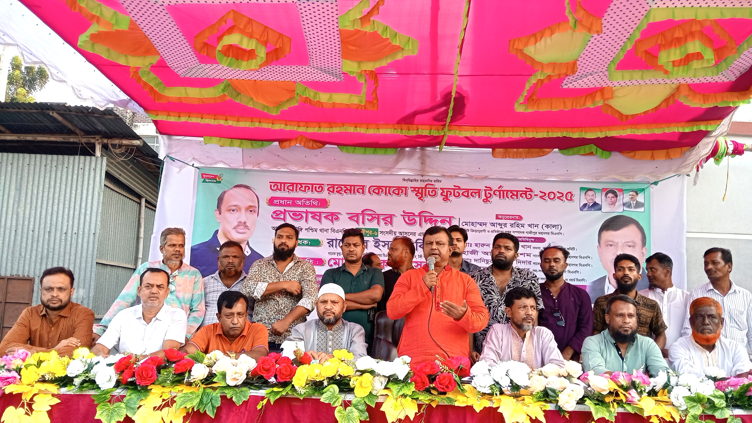 নিজস্ব প্রতিবেদক : গাজীপুরের গাছা থানা এলাকায় যথাযোগ্য মর্যাদায় উদ্বোধন করা হয়েছে আরাফাত রহমান কোকো স্মৃতি ফুটবল টুর্নামেন্ট ২০২৫। শনিবার (২৫ অক্টোবর) বিকেলে কামারজুরি ইউসুফ আলী হাই স্কুল এন্ড গার্লস কলেজ মাঠে এক বর্ণাঢ্য আয়োজনের মধ্য দিয়ে এই টুর্নামেন্টের উদ্বোধন হয়। অনুষ্ঠানে প্রধান অতিথি হিসেবে উপস্থিত ছিলেন টঙ্গী পশ্চিম থানা বিএনপির সভাপতি ও গাজীপুর-৬ আসনের সংসদ সদস্য পদপ্রার্থী প্রভাষক বশির উদ্দিন। উদ্বোধনী বক্তব্যে তিনি বলেন, আরাফাত রহমান কোকো ছিলেন বাংলাদেশের ক্রীড়াঙ্গনের এক উজ্জ্বল নক্ষত্র। তিনি খেলাধুলাকে ভালোবাসতেন, খেলাধুলার মাধ্যমে তরুণ সমাজকে গড়ে তুলতে চেয়েছিলেন। তার স্মৃতিকে ধারণ করে আজকের এই টুর্নামেন্ট আয়োজন আমাদের তরুণ প্রজন্মকে অনুপ্রাণিত করবে। আমি চাই তরুণরা রাজনীতির পাশাপাশি খেলাধুলার দিকেও মনোনিবেশ করুক, কারণ খেলাধুলা মানুষকে শৃঙ্খলাবদ্ধ ও দেশপ্রেমিক করে তোলে। অনুষ্ঠানে সভাপতিত্ব করেন আরাফাত রহমান কোকো স্মৃতি ফুটবল টুর্নামেন্ট পরিচালনা কমিটির আহ্বায়ক ও গাছা থানা বিএনপির সাবেক সাধারণ সম্পাদক ফারুক হোসেন খান, বিশেষ অতিথি হিসেবে উপস্থিত ছিলেন কৃষকদলের কেন্দ্রীয় কমিটির সদস্য হারুন অর রশিদ, গাজীপুর মহানগর বিএনপির সাবেক সদস্য হাজী আবুল কাশেম, দানিছুর রহমান দিনার, গাছা থানা বিএনপির সহ-সভাপতি কামরুজ্জামান বিপ্লব ও ৩৬ নং ওয়ার্ড বিএনপির সাবেক সাধারণ সম্পাদক ইব্রাহিম হোসেন। খেলায় রেফারির দায়িত্ব পালন করেন গাজীপুর মহানগর বিএনপির দপ্তর সম্পাদক ও বিশিষ্ট ক্রীড়ানুরাগী মোহাম্মদ আব্দুর রহমান খান (কালা)। সার্বিক তত্ত্বাবধানে ছিলেন মোঃ ইউসুফ আলী সরকার, মোঃ বেলায়েত মাষ্টার, জাহাঙ্গীর মোল্লা, ইদ্রিস মন্ডল, আবু মোহাম্মদ কাউসার ও আজিজুল হক সরকারসহ বিএনপির বিভিন্ন পর্যায়ের নেতৃবৃন্দ। উদ্বোধনী খেলায় মুখোমুখি হয় হায়দারাবাদ স্পোর্টিং ক্লাব বনাম ঢাকা আরামবাগ স্পোর্টিং ক্লাব। খেলার মাঠে ছিল দর্শকদের উপচে পড়া ভিড় ও উৎসবমুখর পরিবেশ। খেলার ফলাফল ঘোষনা করেন অনুষ্ঠানের প্রধান অতিথি প্রভাষক বসির উদ্দিন। ৬০ মিনিটের হাড্ডাহাড্ডি লড়াই শেষে ঢাকা আরামবাগ স্পোর্টিং ক্লাব ০৩-০১ গোলো ঢাকা আরামবাগ স্পোর্টিং ক্লাব বিজয়ী হয়।