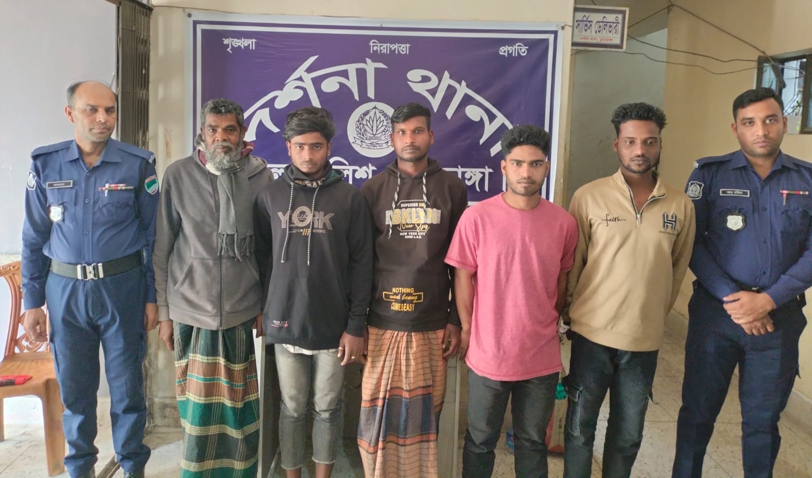 নিজস্ব প্রতিবেদক : চুয়াডাঙ্গা জেলার দর্শনা থানা এলাকায় পুলিশের বিশেষ অভিযানে বিভিন্ন মামলার ৬ জন আসামিকে গ্রেফতার করা হয়েছে। জেলা পুলিশ সুপার চুয়াডাঙ্গার সার্বিক নির্দেশনায় এবং দর্শনা থানার অফিসার ইনচার্জের নেতৃত্বে ২২ ফেব্রুয়ারি ২০২৬ খ্রিস্টাব্দ রাতব্যাপী এ অভিযান পরিচালিত হয়। অভিযানে গ্রেফতারকৃতরা হলেন মোঃ আবুজার মোল্লা (৫৭), পিতা-মৃত রইচ উদ্দীন, সাং-সুজায়েতপুর পূর্বপাড়া, থানা-দর্শনা, জেলা-চুয়াডাঙ্গা। (ননজিআর-৫৩/২৫ এর আসামী) মোঃ রাসেল (২০), পিতা-মফিজুল ইসলাম, সাং-ঠাকুরপুর বাজার, থানা-দর্শনা, জেলা-চুয়াডাঙ্গা। (জিআর-১৫৫/২৫ এর আসামী) মোঃ আব্দুল্লাহ (২৫), পিতা-মৃত আঃ সাত্তার, সাং-ঠাকুরপুর বাজার, থানা-দর্শনা, জেলা-চুয়াডাঙ্গা। (জিআর-১৫৫/২৫ এর আসামী) মোঃ শাহীন (২৩), পিতা-লস্কর আলী, সাং-ঠাকুরপুর বাজার, থানা-দর্শনা, জেলা-চুয়াডাঙ্গা। (জিআর-১৫৫/২৫ এর আসামী, মোছাঃ আকলিমা খাতুন (৪৮), স্বামী-আবুজার মোল্লা, সাং-সুজায়েতপুর পূর্বপাড়া, থানা-দর্শনা, জেলা-চুয়াডাঙ্গা। (ননজিআর-৫৩/২৫ এর আসামী)মোঃ মিলন মিয়া (২৪), পিতা-মোঃ মুনছুর আলী, মাতা-মোছাঃ আনজুরা খাতুন, গ্রাম-মদনা (স্কুলপাড়া), থানা-দর্শনা, জেলা-চুয়াডাঙ্গা। (দর্শনা থানার মামলা নং-১১, তারিখ-২১/০২/২০২৬ খ্রিঃ, ২০১৮ সালের মাদকদ্রব্য নিয়ন্ত্রণ আইনের ৩৬(১) সারণির ১০(ক) ধারার আসামী) পুলিশ জানায়, গোপন সংবাদের ভিত্তিতে অভিযান চালিয়ে বিভিন্ন মামলার ও মাদক সংক্রান্ত অভিযোগে অভিযুক্ত এসব আসামিদের গ্রেফতার করা হয়।গ্রেফতারকৃতদের ২২/০২/২০২৬ তারিখে বিজ্ঞ আদালতে সোপর্দ করা হয়েছে। আইন-শৃঙ্খলা পরিস্থিতি স্বাভাবিক রাখতে এ ধরনের অভিযান অব্যাহত থাকবে বলে জানিয়েছে পুলিশ।