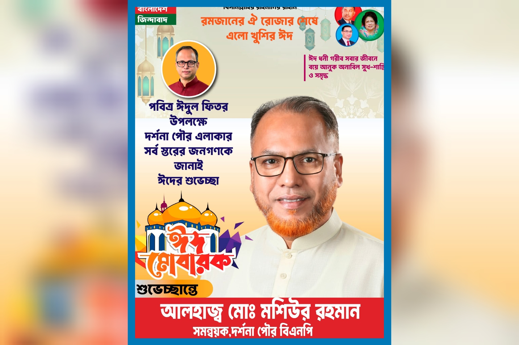 নিউজ ডেস্ক : পবিত্র ঈদুল ফিতর উপলক্ষে দর্শনা পৌরবাসীসহ দেশ-বিদেশে অবস্থানরত সকল শুভানুধ্যায়ী, নেতাকর্মী ও সর্বস্তরের জনগণকে আন্তরিক শুভেচ্ছা ও অভিনন্দন জানিয়েছেন দর্শনা পৌর বিএনপির সমন্বয়ক আলহাজ্ব মোঃ মশিউর রহমান। এক শুভেচ্ছা বার্তায় তিনি বলেন, মহিমান্বিত এক মাসের সিয়াম সাধনা, আত্মশুদ্ধি ও সংযমের পর মুসলিম উম্মাহর মাঝে সমাগত হয়েছে পবিত্র ঈদুল ফিতর। ঈদ আনন্দ, সম্প্রীতি ও ভ্রাতৃত্ববোধের এক অনন্য উপলক্ষ। এই পবিত্র দিনে সকল হিংসা-বিদ্বেষ ও বিভেদ ভুলে গিয়ে পারস্পরিক সৌহার্দ্য, সহমর্মিতা ও ভালোবাসার বন্ধনে আবদ্ধ হওয়ার আহ্বান জানান তিনি। তিনি আরও বলেন, ঈদের প্রকৃত শিক্ষা হলো মানবিকতা, সহমর্মিতা ও পরস্পরের প্রতি সহানুভূতি জাগ্রত করা। পবিত্র ঈদের অনাবিল আনন্দে ঘুচে যাক সকল অন্ধকার, আলোকিত হোক মানুষের হৃদয়। সমাজে শান্তি, সম্প্রীতি ও ঐক্য প্রতিষ্ঠার মাধ্যমে একটি সুন্দর ও সমৃদ্ধ বাংলাদেশ গড়তে সবাইকে একযোগে কাজ করার আহ্বান জানান তিনি। মশিউর রহমান মহান আল্লাহ তাআলার দরবারে দোয়া কামনা করে বলেন, আল্লাহ যেন আমাদের সিয়াম, কিয়াম ও সকল নেক আমল কবুল করেন এবং দেশ ও জাতির জীবনে বয়ে আনেন শান্তি, সমৃদ্ধি ও কল্যাণ।