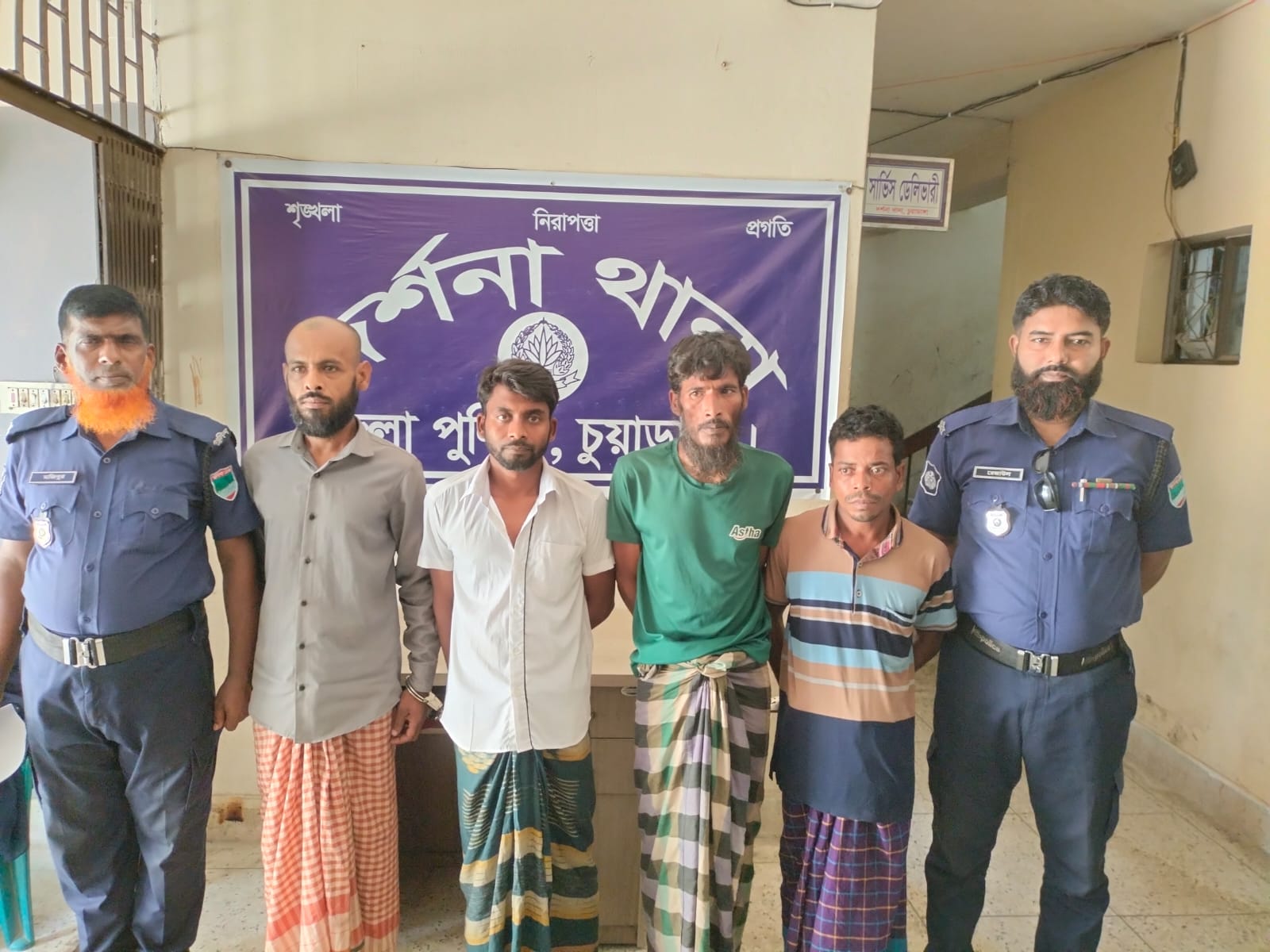 তাকে নিজ বসতবাড়ি হতে গ্রেফতার করা হয়।মোঃ মহি @ মহিউদ্দিন, পিতা-গোপাল মন্ডল, গ্রাম-তিতুদহ, থানা-দর্শনা, জেলা-চুয়াডাঙ্গা। তিনিও জিআর-২৫৭/২০ মামলার পরোয়ানাভুক্ত আসামী। তাকে নিজ বসতবাড়ি হতে গ্রেফতার করা হয়। মোঃ শাহিন, পিতা-অলিল মোল্লা, গ্রাম-উজলপুর (বিলপাড়া), থানা-দর্শনা, জেলা-চুয়াডাঙ্গা। তিনি সিআর-১১৪/২৬ (দর্শনা) মামলার পরোয়ানাভুক্ত আসামী। তাকে নিজ বসতবাড়ি হতে গ্রেফতার করা হয়। মোঃ হারুন অর রশীদ (৪০), পিতা-আওলাদ হোসেন, মাতা-হাজেরা বেগম, গ্রাম-৬২ নং বড় আড়িয়া বসতিপাড়া, থানা-দর্শনা, জেলা-চুয়াডাঙ্গা। তাকে ১০০ গ্রাম গাঁজাসহ গ্রেফতার করা হয়। পুলিশ সূত্রে জানা যায়, গ্রেফতারকৃত আসামীদের ২৫ এপ্রিল ২০২৬ তারিখে বিজ্ঞ আদালতে সোপর্দ করা হয়েছে।
