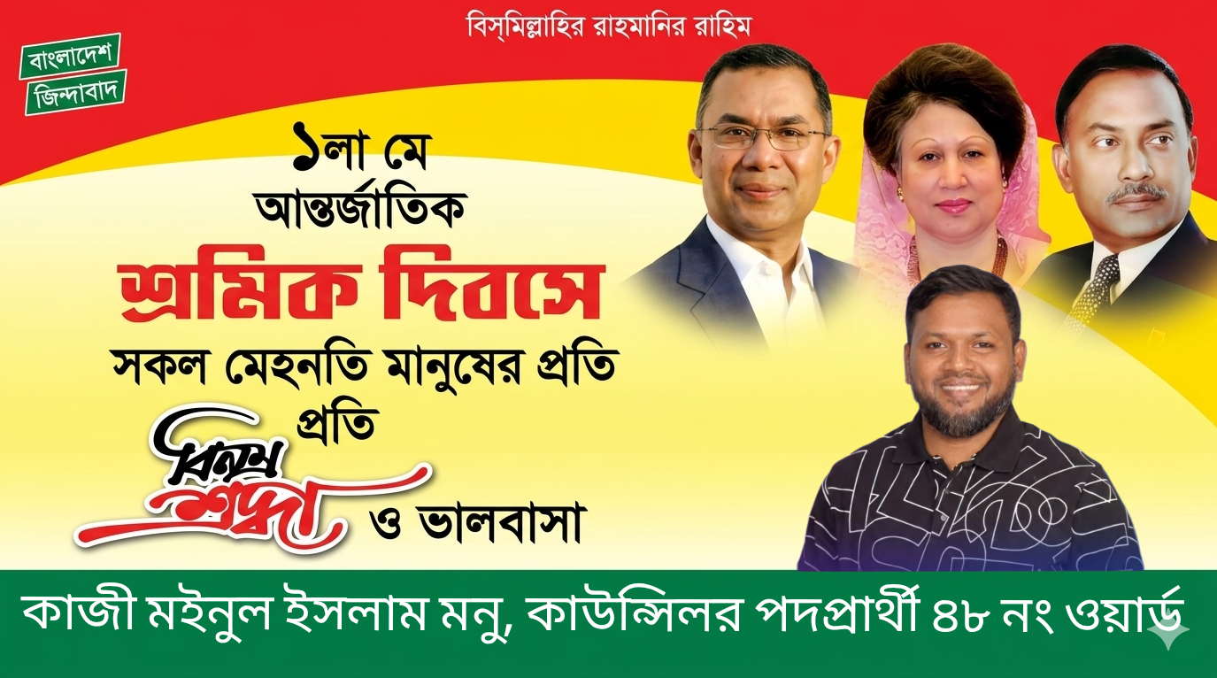 মহান মে দিবসে শ্রমজীবী মানুষের প্রতি শ্রদ্ধা ও সংহতি জানালেন ৪৮ নং ওয়ার্ডের কাউন্সিলর পদপ্রার্থী কাজী মইনুল ইসলাম মনু
