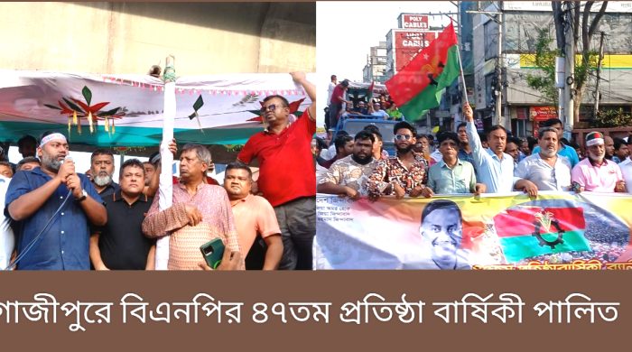নিজস্ব প্রতিবেদক: কেন্দ্রীয় কর্মসূচির অংশ হিসেবে গাজীপুরে নানা আয়োজনের মধ্য দিয়ে বিএনপির ৪৭তম প্রতিষ্ঠাবার্ষিকী উদযাপন করা হয়েছে। এ উপলক্ষে সোমবার (১ সেপ্টেম্বর) দুপুর থেকে বিএনপি, অঙ্গ ও সহযোগী সংগঠনের নেতা-কর্মীরা