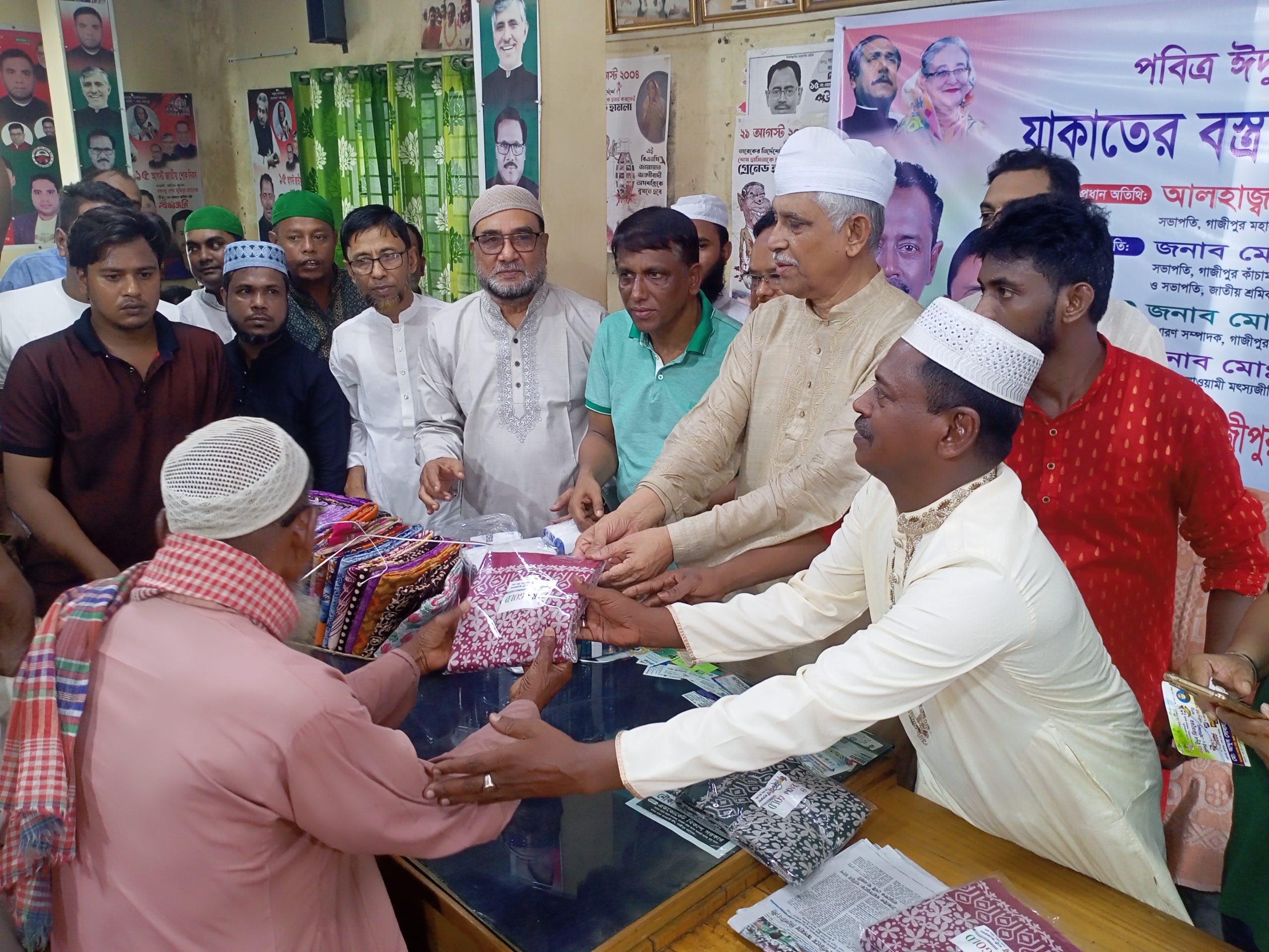 টঙ্গী (গাজীপুর) প্রতিনিধি : পবিত্র ঈদুল ফিতর উপলক্ষে গাজীপুর কাঁচামাল আড়ৎদার মালিক গ্রুপের উদ্যোগে হত দরিদ্র নিম্ম আয়ের মানুষের মাঝে যাকাতের কাপড় বিতরণ অনুষ্ঠান শনিবার (৬ এপ্রিল) গাজীপুর কাঁচামাল আড়ৎদার মালিক গ্রুপে কার্যালয়ে অনুষ্ঠিত হয়েছে। গাজীপুর কাঁচামাল আড়ৎদার মালিক গ্রুপ পরিচালনা কমিটির সভাপতি, বাসন থানা জাতীয় শ্রমিক লীগের সভাপতি মোঃ আব্দুস সোবহানের সভাপতিত্বে এবং বাসন মেট্রো থানা মৎস্য জীবী লীগের সভাপতি মোঃ সুলতান মন্ডলের পরিচালনায় যাকাতের কাপড় বিতরণ অনুষ্ঠানে প্রধান অতিথি হিসেবে বক্তব্য রাখেন গাজীপুর মহানগর আওয়ামী লীগের সভাপতি, গাজীপুর উন্নয়ন কর্তৃপক্ষের চেয়ারম্যান বীর মুক্তিযোদ্ধা আলহাজ্ব এ্যাড. মোঃ আজমত উল্লা খান। বিশেষ অতিথি হিসেবে বক্তব্য রাখেন বাসন মেট্রো থানা আওয়ামীলীগের সভাপতি আলহাজ্ব মোঃ আবুল কাশেম। কাঁচামাল আড়ৎদাড় মালিগ্রুপের উপদেষ্টা মোঃ আবুল হোসেন মন্ডল, সাধারণ সম্পাদক সাজাহান খন্দকার এ্যাড. বিকাশ সরকার, আলমগীর হোসেন, মোঃ ওসমান গনী, দেলোয়ার হোসেন, আব্দুল রাজ্জাক, শাজাহান তপন প্রমুখ। এসময় গাজীপুর কাঁচামাল আড়ৎদাড় মালিক গ্রুপের দাবীর পরিপ্রেক্ষিতে গাজীপুর মহানগর আওয়ামী লীগের সভাপতি, গাজীপুর উন্নয়ন কর্তৃপক্ষের চেয়ারম্যান বীর মুক্তিযোদ্ধা এ্যাড. মোঃ আজমত উল্লা খানকে মালিকগ্রুপের প্রধান উপদেষ্টা করা হয়েছে। পরে হত দরিদ্র নিম্ম আয়ের মানুষের মাঝে পবিত্র ঈদুল ফিতর উপলক্ষে যাকাতের কাপড় বিতরণ করা হয়েছে।