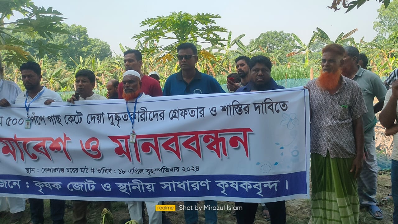 নিজস্ব প্রতিবেদক : চুয়াডাঙ্গার সি,এন্ড,বি পাড়ার কৃষক আপিল উদ্দীনের ৪১ শতক জমিতে লাগানো প্রায় ৫০০ পেঁপে গাছ কেটে দেয়া দুষ্কৃতিকারীদের গ্রেফতার ও শাস্তির দাবীতে সমাবেশ ও মানববন্ধন অনুষ্ঠিত হয়েছে। ১৮ এপ্রিল বৃহস্পতিবার সকাল সাড়ে ৯টায় চুয়াডাঙ্গা সি,এন্ড,বি পাড়ার চরের মাঠে কৃষক আপিল উদ্দীনের কেটে দেয়া পেঁপে বাগানে এই সমাবেশ ও মানববন্ধন অনুষ্ঠিত হয়। জানা যায়, গত ১৫ এপ্রিল সোমবার আনুমানিক সকাল ৮ টার দিকে স্থানীয় পৌর কাউন্সিলর মনছুর আলী মনো ও রবিউল ইসলামের নেতৃত্বে পাঁচ/সাত জন দুষ্কৃতিকারী আপিল উদ্দীনের ৪১ শতক জমিতে লাগানো প্রায় ৫০০ পেঁপে গাছ কেটে দেয়। বিষয়টি জানতে পেরে ভুক্তভোগী কৃষক আপিল উদ্দীন চুয়াডাঙ্গা সদর থানায় একটি অভিযোগ দাখিল করেন। কিন্তু গত দুইদিনেও দুষ্কৃতিকারীদের বিরুদ্ধে কোন ব্যবস্থা না নেয়ায় চুয়াডাঙ্গা জেলা কৃষকজোট ও স্থানীয় কৃষকদের পক্ষ থেকে প্রতিবাদ সমাবেশ ও মানববন্ধনের আয়োজন করা হয়। মানববন্ধন ও প্রতিবাদ সমাবেশে বক্তব্য রাখেন জেলা কৃষক জোটের সাধারণ সম্পাদক শাহজাহান আলী বিশ্বাস, ভুক্তভোগী কৃষক আপিল উদ্দীন, কৃষক নেতা ওমর আলী মন্ডল, আব্দুর রাজ্জাক, জাহাঙ্গীর, ইকরামুল প্রমুখ। বক্তারা স্থানীয় প্রশাসনের দৃষ্টি আকর্ষণ করে চিহ্নিত দুষ্কৃতিকারীদের দ্রুত গ্রেফতার, দৃষ্টান্তমূলক শাস্তি ও ক্ষতিগ্রস্ত কৃষক আপিল উদ্দীনের ক্ষতিপূরণ প্রদানের দাবী জানান। মানববন্ধন ও প্রতিবাদ সমাবেশে কৃষক জোট নেতৃবৃন্দসহ স্থানীয় শতাধিক কৃষক অংশগ্রহণ করেন।