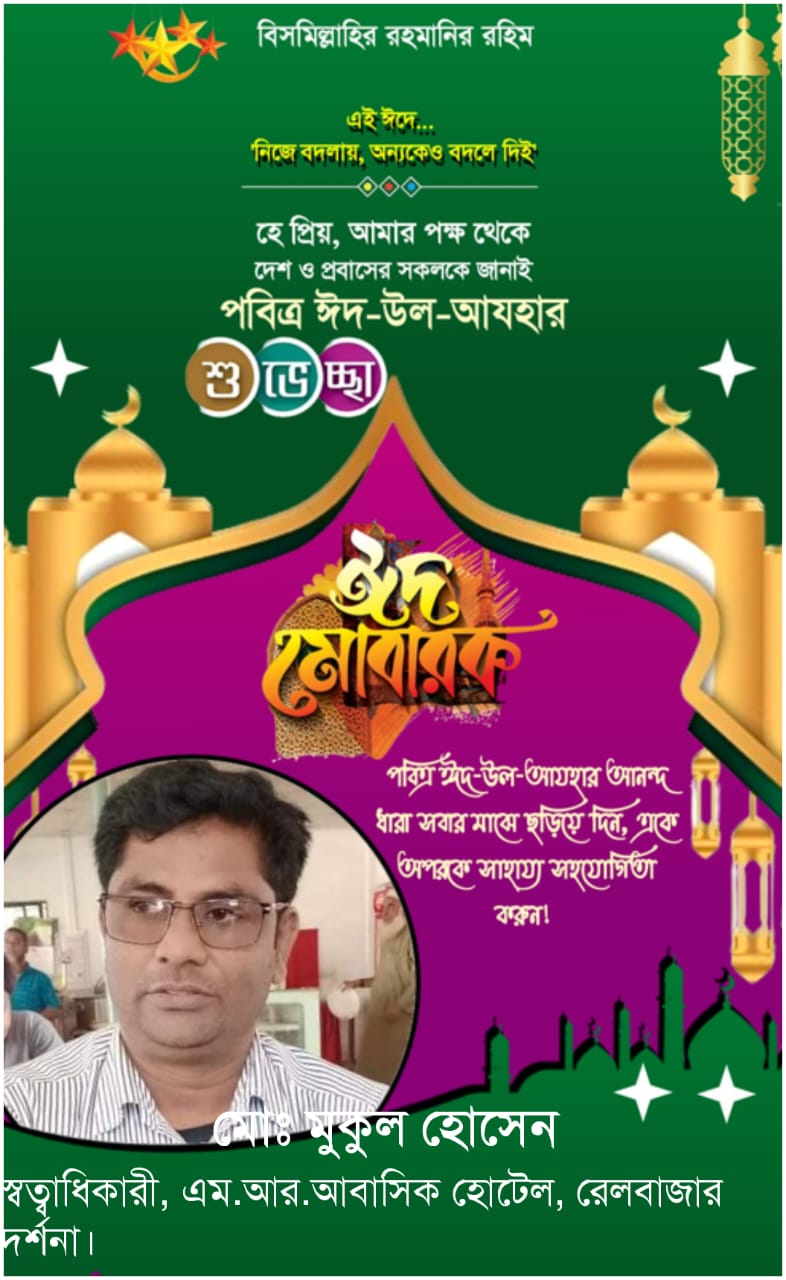 ঈদ মানে আনন্দ ঈদ মানে খুশি , ঈদের আনন্দে ভুলে যাক সকল হিংসা বিদ্বেষ, মিলিত হয় সম্প্রীতির বাধনে। পবিত্র ঈদের আনন্দে ঘুচে যাক সকল আধার, জাগ্রত হোক মানবিকতা।ঈদের খুশিতে ভরে উঠুক সবার ঘর। পবিত্র ঈদকে সামনে রেখে সকল শুভানুধ্যায়ীকে জানাই পবিত্র ঈদ-উল আযহা'র শুভেচ্ছা ও অভিনন্দন ।