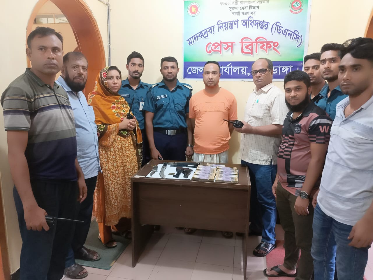 নিজস্ব প্রতিবেদক : চুয়াডাঙ্গা জেলা মাদকদ্রব্য নিয়ন্ত্রণ অধিদপ্তরের অভিযানে একটি বিদেশি ৯ এম এম পিস্তল, একটি ম্যগজিন, ৪ রাউন্ড গুলি, ২ টা দেশীয় অস্ত্র ও ১১ লক্ষ টাকাসহ একজনকে গ্রেপ্তার করা হয়েছে। ২১ আগস্ট বুধবার সকাল ১০ ঘটিকার সময় চুয়াডাঙ্গা সদর থানাধীন বাগানপাড়া আসামির ভাড়া বাড়ি থেকে আটক করা হয়। পরে আলমারী তল্লাশি করে এসব অস্ত্র ও টাকা উদ্ধার করা হয়। সূত্রে জানাগেছে, চুয়াডাঙ্গা জেলা মাদকদ্রব্য নিয়ন্ত্রণ অধিদপ্তরের পরিদর্শক নাজমুল হোসেন খান এর নেতৃত্বে ও মাদকদ্রব্য নিয়ন্ত্রণ অধিদপ্তরের উপ পরিদর্শক সাহারা ইয়াসমিন সহ , মাদকদ্রব্য নিয়ন্ত্রণ অধিদপ্তর জেলা কার্যালয়ের সঙ্গীয় ফোর্স গোপন সংবাদের ভিত্তিতে জানতে পারে যে, চুয়াডাঙ্গা সদর থানাধীন বাগান পাড়ার সাজেদুল ইসলামের পাঁচতলা বাড়ির দ্বিতীয় তলার ভাড়াটিয়া পৌর এলাকার মুক্তি পাড়ার মৃত আব্দুল মান্নানের ছেলে মো: হাবিবুর রহমান রাজিব (৪০) ইয়াবা ট্যাবলেটের একটি বড় চালান রেখেছে এই সংবাদ প্রাপ্ত হয়ে চুয়াডাঙ্গা জেলা মাদকদ্রব্য নিয়ন্ত্রন অধিদপ্তর কার্যালয়ের অফিসার ও সঙ্গীয় ফোর্স ঐ বাড়িতে অভিযান পরিচালনা করে। এসময় আসামীর বাড়ির গেট খুলতে বল্লে সে ১৫ মিনিট পর দরজা খুলে দেয়। এসময় আসামির ভাড়া বাড়ি হতে আলমারী তল্লাশি করে একটি ৯ এম এম পিস্তল, একটি ম্যগজিন, ৪ রাউন্ড গুলি, ২ টা দেশীয় অন্ত্র, ১১ লক্ষ টাকাসহ গ্রেপ্তার করা হয়, উক্ত গ্রেফতারকৃত আসামীকে আইনগত ব্যবস্থা গ্রহণের প্রক্রিয়া চলছে বলে জানাগেছে। আটককৃত আসামী প্রাথমিক জিজ্ঞাসাবাদে তার বিরুদ্ধে একটি মাদক মামলা আছে বলে স্বীকার করেছেন।