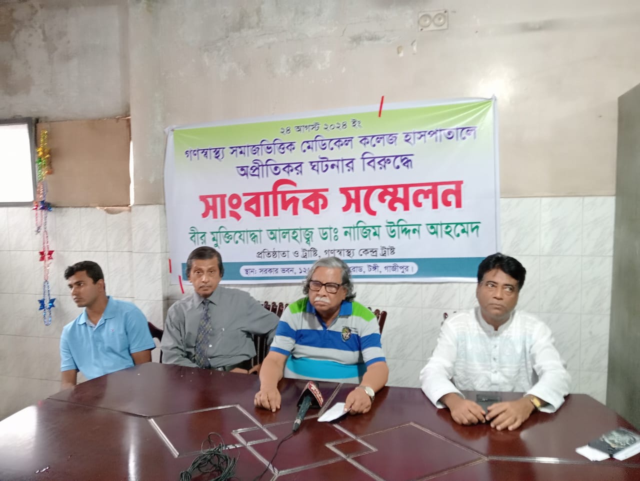 নিজস্ব প্রতিবেদক : গণস্বাস্থ্য সমাজভিত্তিক মেডিকেল কলেজ হাসপাতালে অপ্রীতিকর ঘটনা ও জোর করে পদত্যাগ করানোর প্রতিবাদে টঙ্গীতে নিজ বাড়িতে সাংবাদিক সম্মেলন করেছেন সাভার গণস্বাস্থ্য কেন্দ্রের ট্রাস্টি মুক্তিযোদ্ধা নাজিম উদ্দিন আহমেদ। এর আগে তিনি মরহুম ডাঃ জাফর উল্লাহর স্ত্রীসহ কয়েকজন ডাক্তারের বিরুদ্ধে থানায় জিডি করেন। সোমবার (২৬ আগষ্ট) বিকেলে টঙ্গীর আনারকলি রোডে নিজ বাড়িতে সাংবাদিক সম্মেলন করেন গণস্বাস্থ্য কেন্দ্রের ট্রাস্টি বীর মুক্তিযোদ্ধা নাজিম উদ্দিন আহমেদ। সম্মেলনে বলা হয়, গণস্বাস্থ্য কেন্দ্রের ট্রাস্টি ডাঃ জাফর উল্লাহর মৃত্যুর পর ট্রাস্টি মুক্তিযোদ্ধা নাজিম উদ্দিন আহমেদ গণস্বাস্থ্য সমাজভিত্তিক মেডিকেল কলেজ ও হাসপাতালের দায়িত্ব পালন করে আসছেন। ২৪ আগষ্ট একদল লোক এসে জোর করে তার নিকট থেকে কাজ না করার কথা লিখে একটি কাগজে স্বাক্ষর নেন। এই ঘটনার প্রতিবাদে ঢাকার আশুলিয়া থানায় একটি জিডিও করেন ডাঃ নাজিম। জিডিতে মরহুম ডাঃ জাফর উল্লাহর স্ত্রী ডাঃ শিরিন হক, ডাঃ কনা চৌধুরী, ডাঃ ফরিদা ইয়াসমিন ও ডাঃ আবুল বাসারের নির্দেশে একদল বহিরাগত লোক জোরপূর্বক অফিসে প্রবেশ করে পদত্যাগের কাগজে স্বাক্ষর নেয়। কাগজে গণস্বাস্থ্য কেন্দ্রের সকল কাজ থেকে অব্যাহতি নেয়ার কথাও লিখানো হয়েছে। সম্মেলনে তিনি অভিযোগ করে বলেন, গণস্বাস্থ্য কেন্দ্রের আমিই একমাত্র বৈধ ট্রাস্টি। আমার কাছ থেকে জোরকরে কাজ না করার কাগজে স্বাক্ষর নেয়া হয়েছে। আমাকে হেনস্তাও করা হয়েছে। আমি এই ঘটনার তীব্র নিন্দা ও প্রতিবাদ জানিয়ে বর্তমান সরকারের নিকট ন্যায় বিচার দাবী করছি। সাংবাদিক সম্মেলনে তিনি আরো বলেন অন্তবর্তীকালীন সরকার ঘোষন ছিলো জোর করে কারো কাছ থেকে স্বাক্ষর নেওয়া যাবে না,,,সরকারের কথার প্রেক্ষিতে ডাক্তার নাজিম উদ্দিন আহমেদ বলেন, বিগত ২৪শে আগস্ট গণস্বাস্থ্য সমাজ ভিত্তিক মেডিকেল কলেজ হাসপাতালে, প্রতিষ্ঠাতা ও ট্রাস্টি বীর মুক্তিযোদ্ধা আলহাজ্ব ডাক্তার নাজিম উদ্দিনের সাথে অপ্রতিকর ঘটনা ঘটেছে তাই আজকের এই সংবাদ সম্মেলন ডাক্তার নাজিম উদ্দিন আহমেদ উনার বক্তব্যে আরো বলেন -অন্তর্বর্তীকালীন সরকার ঘোষণা দেওয়ার পরেও আমার সাথে যা ঘটনা ঘটেছে তা অবশ্য অপ্রত্যাৎসিত,আমি একজন বীর মুক্তিযোদ্ধা,আমি একজন রাজনৈতিক ব্যক্তি,আমি একজন উপ অধিনায়ক,আমি একজন প্রতিষ্ঠাতা এবং আমি একজন ট্রাস্টি সদস্য, আমি পূর্বে সমাজ উন্নয়ন মূলক কাজে মাদার তেরেসা স্বর্ণপদক পুরস্কার প্রাপ্ত হয়েছি, তিনি আক্ষেপ করে বলেন সর্বোপরি আমি একজন বীর মুক্তিযোদ্ধা,স্বাধীনতার জন্য নিজের জীবনকে উৎসর্গ করেছি,একটি লাল সবুজের পতাকা দিয়েছি, আমার প্রতিষ্ঠিত আজকের গণস্বাস্থ্য কেন্দ্রের অসাধু,চোর,দুর্নীতিব