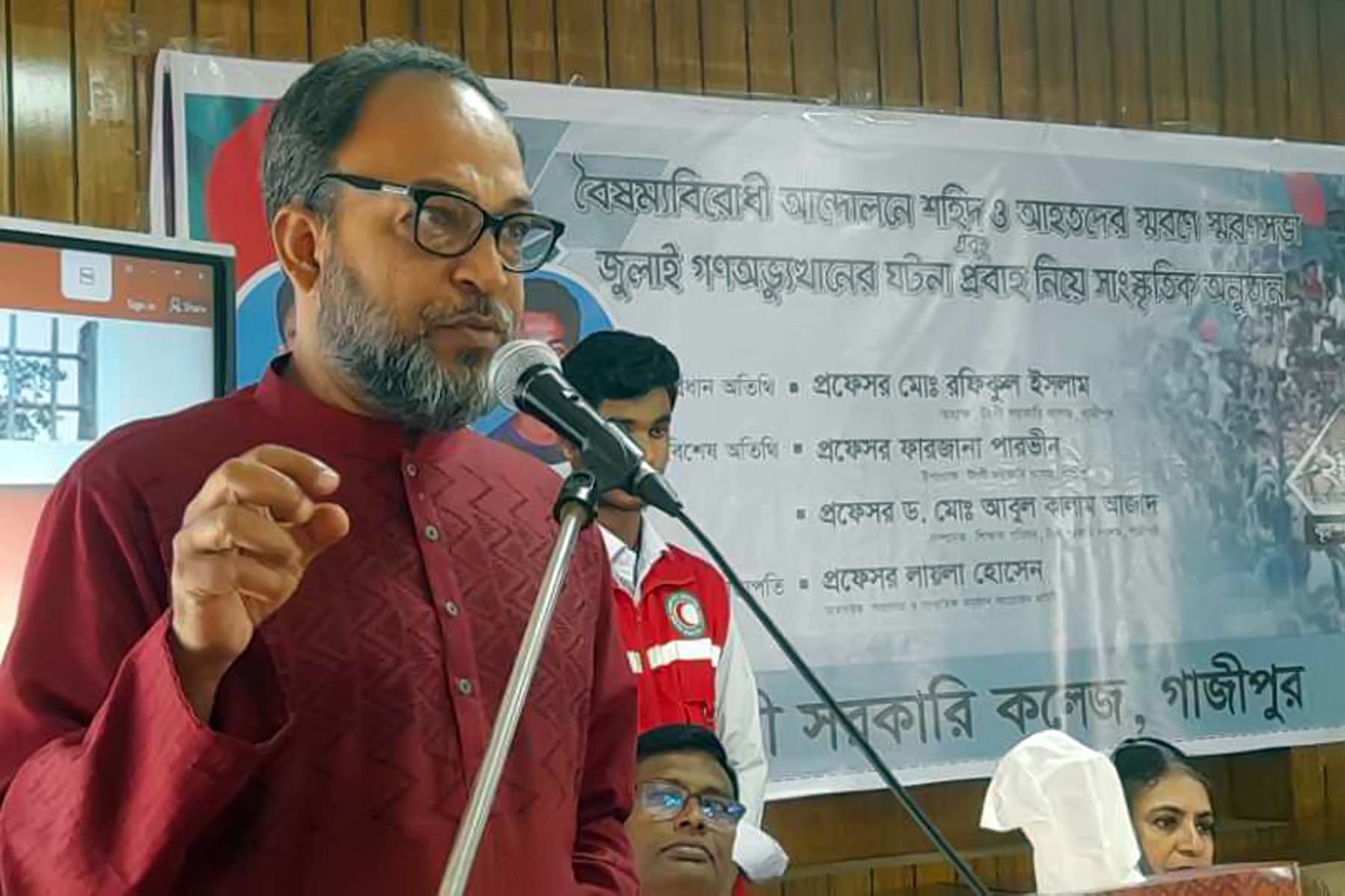 নিজস্ব প্রতিবেদক : টঙ্গী সরকারি কলেজের বৈষম্য বিরোধী ছাত্র আন্দোলনের শিক্ষার্থী শহিদ ফাহমিন জাফর, রেদওয়ান হোসেন ও শাকিল হোসেন এবং আহতদের স্মরণে এবং জুলাই গণঅদ্ভুত্থানের ঘটনা প্রবাহ নিয়ে টঙ্গী সরকারি কলেজে এক স্মরণসভা ও সাংস্কৃতিক অনুষ্ঠান অনুষ্ঠিত হয়েছে। বৃহস্পতিবার দুপুরে টঙ্গী সরকারি কলেজ অডিটোরিয়াম হলরুমে এই আলোচনা সভা ও সাংস্কৃতিক অনুষ্ঠান অনুষ্ঠিত হয়। আয়োজক কমিটির আহ্বায়ক প্রফেসর লায়লা হোসেনের সভাপতিত্বে প্রধান অতিথি হিসেবে উপস্থিত ছিলেন টঙ্গী সরকারি কলেজের অধ্যক্ষ প্রফেসর রফিকুল ইসলাম, বিশেষ অতিথি হিসেবে উপস্থিত ছিলেন টঙ্গী সরকারি কলেজের উপাধ্যাক্ষ প্রফেসর ফারজানা পারভীন,শিক্ষক পরিষদের সম্পাদক প্রফেসর ডঃ মোঃ আবুল কালাম আজাদ, ইংরেজি বিভাগের অধ্যক্ষ তাহমিননা সুবহা,সহিদ ফাহমিন জাফর মা লিলি বেগম ,শাকিল হোসেন এর বাবা বেলায়েত হোসেন,,বৈষম্য বিরোধী ছাত্র নেতা সাইফুল ইসলাম আকাশ,ছাত্রদলের সাবেক আহ্বায়ক মনিরুজ্জামান তানজিদ,যুগ্ন আহবায়ক এম এইচ আরিফ,আহবায়ক সদস্য ইমতিয়াজ আহমেদ সিজান প্রমুখ।