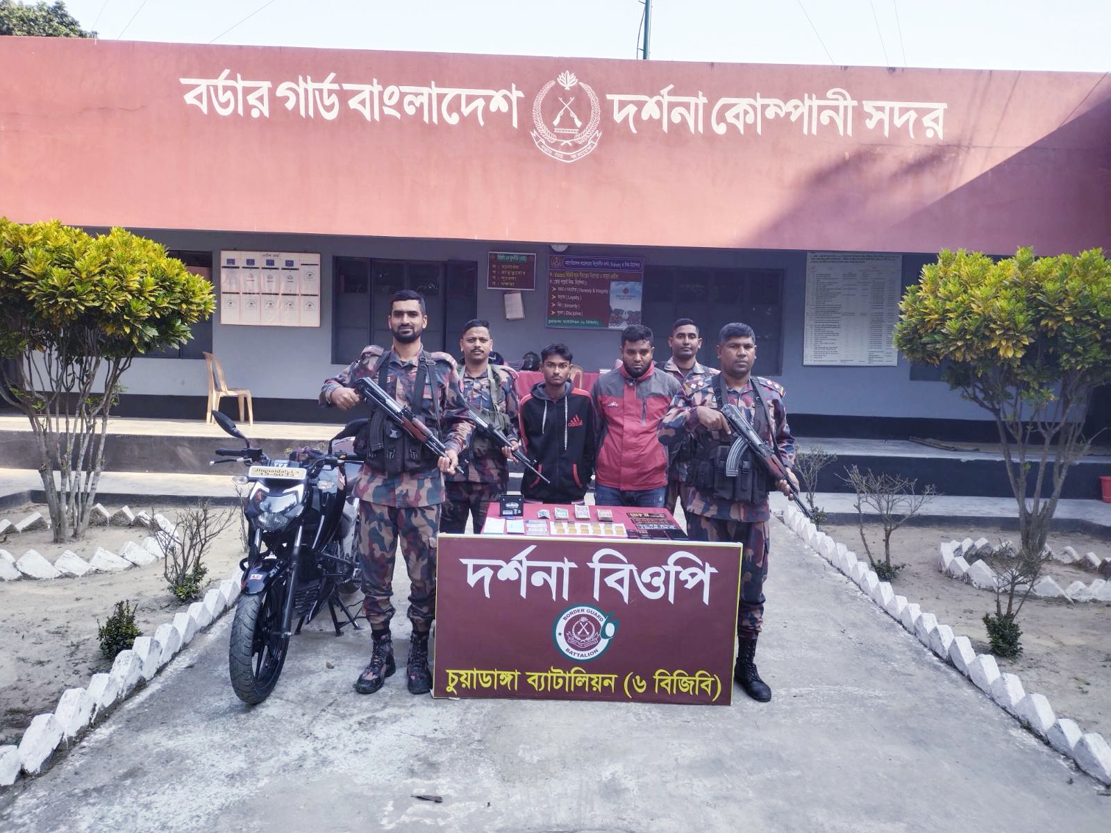 নিজস্ব প্রতিবেদক : চুয়াডাঙ্গা-বর্ডার গার্ডের দর্শনা ক্যাম্পের বিজিবি সদস্যরা চোরাচালান বিরোধী অভিযান চালিয়ে উদ্ধার করেছে নকল সোনার বার, নগদ টাকা ও মোটর সাইকেল। আটক করা হয়েছে হেলাল ও সৌরভ নামের ২ জন অভিযুক্ত চোরাকারবারীকে। আটককৃতদের বিরুদ্ধে দায়ের করা হয়েছে মামলা। চুয়াডাঙ্গা-৬ বর্ডার গার্ডের পরিচালক লেঃ কর্নেল সাঈদ মোহাম্মদ জাহিদুর রহমানের নির্দেশে দর্শনা বিজিবি ক্যাম্পের টহল কমান্ডার নায়েক জিয়াউর রহমান গোপন সংবাদের ভিত্তিতে সঙ্গীয় সদস্যদের নিয়ে গত বৃহস্পতিবার বিকাল সাড়ে ৩ টার দিকে স্বর্ণ চোরাচালান বিরোধী অভিযান চালান দর্শনা কেরুজ মিলস গেটের সামনের লিয়াকত মার্কেটের আব্দুল্লাহ আল আমিন অটেতো (হোন্ডা গ্যারেজ)। ওই গ্যারেজে বিজিবি সদস্যরা তল্লাশি অভিযান চালিয়ে উদ্ধার করেছে স্বর্ণের বারের মতো ১২ টি যা সোনালী রং করা, স্বর্ণের বারের মতো থৈরীকৃত ৪ টি লোহার বার রং বিহীন, নগদ ২ লাখ ৩৪ হাজার ১৫০ টাকা, ব্যবহৃত একটি মোটর সাইকেল, একাধীক মোবাইল ফোন সহ বিভিন্ন সরঞ্জামাদি। এ ঘটনায় বিজিবি আটক করেছে দর্শনা রামনগরের আয়ুব আলীর ছেলে হেলাল উদ্দিন (২৮) ও পারকৃষ্ণপুরের আশরাফুল আলমের ছেলে সৌরভকে (১৬)। নায়েক জিয়াউর রহমান বাদি হয়ে গতকাল শুক্রবার আটককৃতদের বিরুদ্ধে দর্শনা থানায় মামলা দায়ের করেছেন।।
