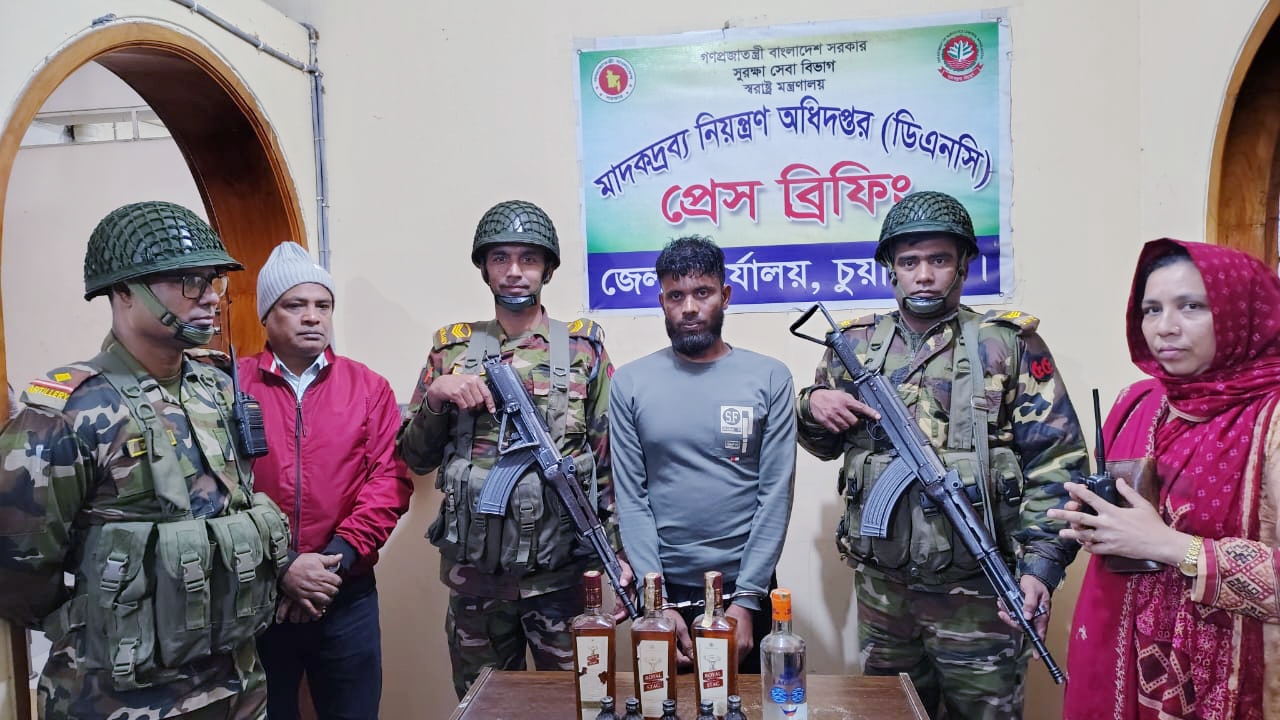 নিজস্ব প্রতিবেদক : চুয়াডাঙ্গায় যৌথ বাহিনী অভিযান চালিয়ে ৪ বোতল বিদেশী মদ ও ৫ বোতল ফেন্সিডিল সহ এক মাদক কারবারিকে আটক করেছে। সোমবার ৯ ডিসেম্বর বেলা সাড়ে ১১ ঘটিকায় সময় চুয়াডাঙ্গা সদর উপজেলার পুরাতন দৌলতদিয়াড় বঙ্গজ পাড়া থেকে তাকে আটক করা হয়। সূত্রে জানাগেছে, চুয়াডাঙ্গা সদর উপজেলায় বিভিন্ন জায়গায় মাদকদ্রব্য নিয়ন্ত্রণ অধিদপ্তরের পরিদর্শক নাজমুল হোসেন খান এর নেতৃত্বে মাদকদ্রব্য নিয়ন্ত্রণ অধিদপ্তর এর বিভাগীয় ১৪ জন স্টাফ, ৫৫ পদাতিক ডিভিশনের ওয়ারেন্ট অফিসার জাহিদুল আলম এর নেতৃত্বে সেনাবাহিনী ১৬ জন সদস্য সহ চুয়াডাঙ্গা সদর থানাধীন বিভিন্ন এলাকায় যৌথ অভিযান করে পুরাতন দৌলতদিয়াড় বঙ্গজ পাড়া , থেকে চিহ্নিত মাদক ব্যবসায়ী মোঃ তরিকুল ইসলাম(৪০) , পিতাঃ আহসান হাবিব দৌলতদিয়া বঙ্গজ পাড়া,চুয়াডাঙ্গা সদর,চুয়াডাঙ্গা,কে নিজ দখলীয় বাড়ি থেকে ৪ বোতল বিদেশী মদ এবং ৫ বোতল ফেনসিডিল সহ গ্রেপ্তার করা হয়। উক্ত আসামীর বিরুদ্ধে নাজমুল হোসেন খান পরিদর্শক বাদী হয়ে চুয়াডাঙ্গা সদর থানায় একটি নিয়মিত মামলা দায়ের করার প্রস্তুতি চলছে ।
