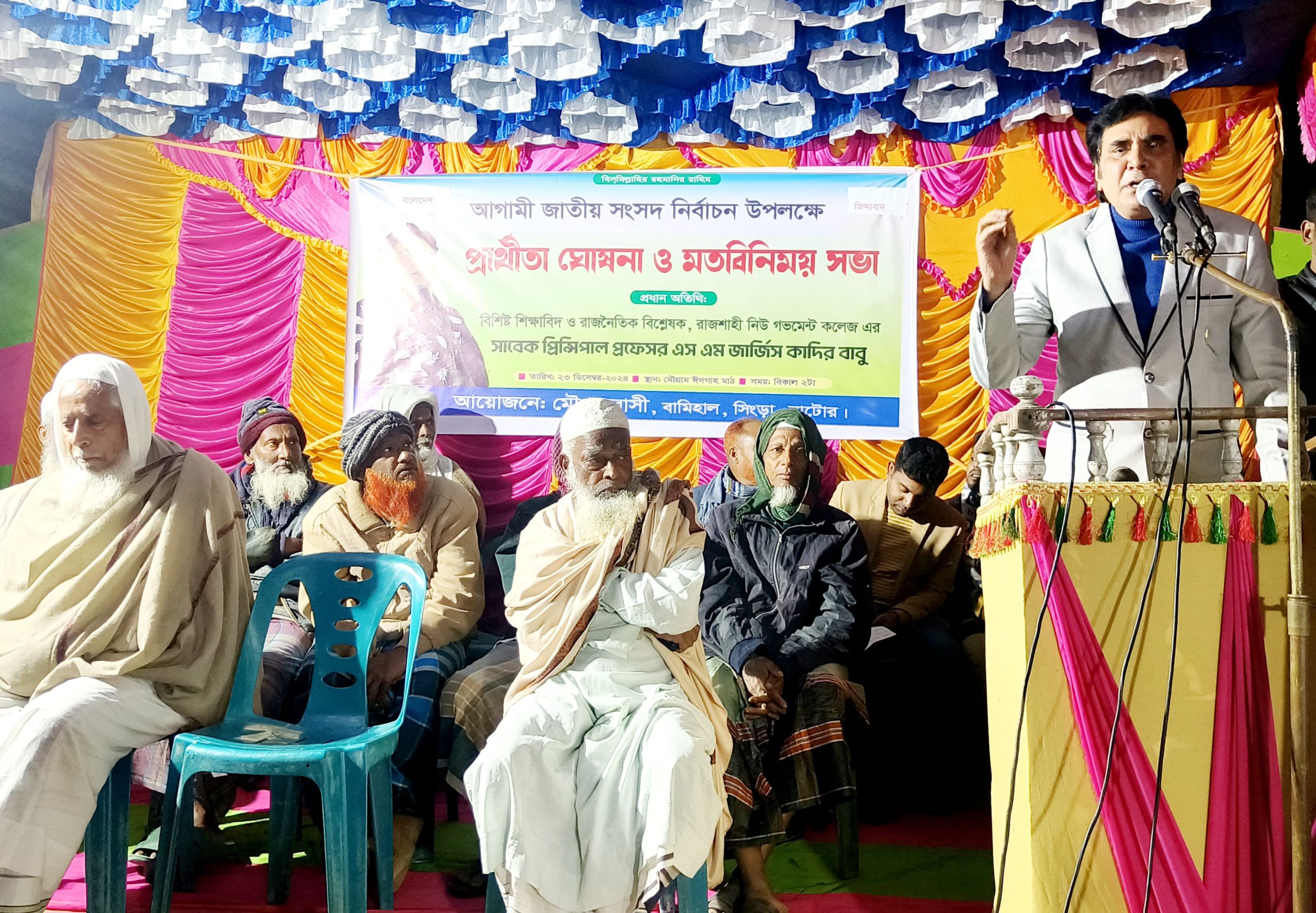নাটোর প্রতিনিধি: নাটোর-৩ (সিংড়া) আসনে আসন্ন জাতীয় সংসদ নির্বাচনে প্রার্থীতা ঘোষণা ও মতবিনিময় করেছেন বিএনপির রাজনীতির সাথে যুক্ত, রাজশাহী নিউ গভমেন্ট ডিগ্রী কলেজের সাবেক অধ্যক্ষ, বিশিষ্ট শিক্ষাবিদ ও রাজনৈতিক বিশ্লেষক এস এম জার্জিস কাদির বাবু।সোমবার রাত ৮টায় তার নিজ গ্রাম সিংড়া উপজেলার সুকাশ ইউনিয়নের মৌগ্রাম ঈদগাহ মাঠে গ্রামবাসী আয়োজিত মতবিনিময় অনুষ্ঠানে প্রার্থীতা ঘোষণা করেন জার্জিস কাদির বাবু। মো. মসলেম উদ্দিন প্রামাণিক এর সভাপতিত্বে প্রভাষক মো. আলী হাসান ও আউয়াল হোসেনের সঞ্চালনায় বক্তব্য দেন জার্জিস কাদির বাবুর সহধর্মিণী নুরমহল, পুত্র এস এম অনিন্দ্য জার্জিস, গ্রামবাসী সহকারী অধ্যাপক জনাবুল ইসলাম বাচ্চু, আলহাজ্ব আত্তাব, সরদার মোহাম্মদ আলী, সরদার আফছার, দুদু, আব্দুল প্রমুখ।প্রধান অতিথির বক্তব্যে জার্জিস কাদির বাবু বলেন, অবশ্যই আমি মৌগ্রামের কৃতি সন্তান, সিংড়ার যেকজন সূর্য সন্তান রয়েছে আমি তার মধ্যে একজন। আমি ইন্দিরা গান্ধী শান্তি পুরষ্কার, জজ হ্যারিসন স্বাধীনতা পুরষ্কার, বিচারপতি মাহবুব মোর্শেদ স্বর্ণ পদক পেয়েছি। সুতরাং এ সকল বিচারে এই গ্রামের সমস্ত কিছু উচ্চতর কর্মকান্ড ও অর্জনের ক্ষেত্রে আমিই প্রথম এবং গ্রামবাসী যদি বলে আমি মৌগ্রামের কৃতি সন্তান, তাহলে এটাই সত্য। তিনি আরও বলেন, আমি বিসিএস ক্যাডার হয়ে চাকুরিতে যোগদানের পর থেকেই এই জনপদের জন্য কিছু করতে ইচ্ছুক। তার ফলস্রুতিতে আমার রাজনীতিকে আসা। রাজনীতি ও সংসদে শিক্ষিত ব্যক্তি দরকার। বৈষম্য বিরোধী ছাত্র-জনতার আন্দোলনের একজন সম্মুখযোদ্ধা হিসেবে আজীবন এই জনপদ ও মানুষের সেবা করার লক্ষ্যে নাটোর-৩ (সিংড়া) আসন থেকে সংসদ সদস্য পদে নির্বাচন করে সংসদে প্রতিনিধিত্ব করতে চাই।