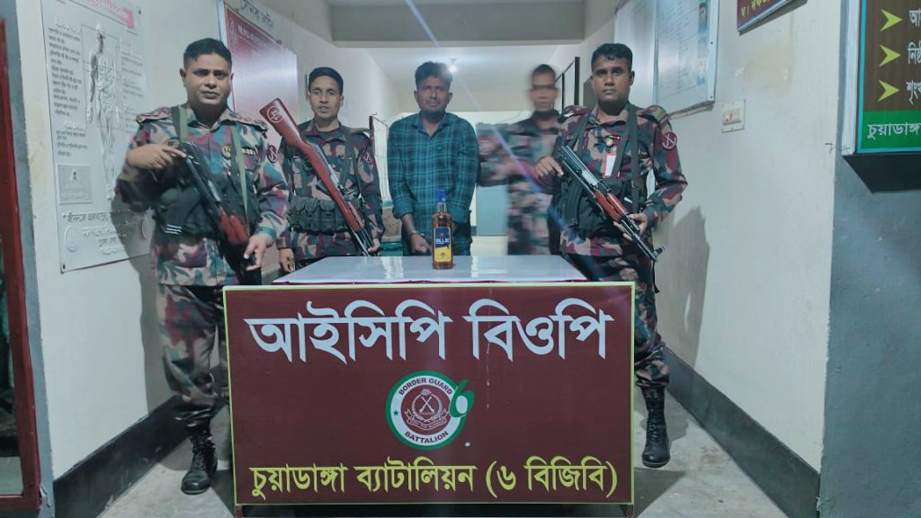 নিজস্ব প্রতিবেদক : চুয়াডাঙ্গার দর্শনা চেকপোস্টে ভারতীয় মদসহ এক ভুয়া পুলিশকে আটক করেছে বিজিবি। ভারতীয় মদসহ ভুয়া পুলিশ পরিচয়ে ০১ জন ব্যক্তিকে আটক করা প্রসংগে বিজিবির দর্শনা আন্তর্জাতিক চেকপোস্ট (আইসিপি) ক্যাম্প জানান, চুয়াডাঙ্গা ব্যাটালিয়ন (৬ বিজিবি) এর দর্শনা আইসিপিতে কর্মরত হাবিলদার মোঃ শহিদুল ইসলাম এর নেতৃত্বে একটি টহলদল আজ বৃহস্পতিবার (২৬ ডিসেম্বর) বিকেল ৫টার দিকে দর্শনা আইসিপির সামনে হতে ভারতীয় ১ বোতল মদ ও ১ টি রিয়েলমি মোবাইলসহ ভুয়া পুলিশ কনস্টেবল পরিচয় প্রদানকারী একজনকে আটক করা হয়। আটককৃত আসামী শিমুল কুমার ঘোষ (৩৫) ঝিনাইদহ জেলার নগরবাথান গ্রামের মন্টু লাল ঘোষের ছেলে। তার বিরুদ্ধে মামলা দিয়ে দর্শনা থানায় সোপর্দ করা হয়েছে।