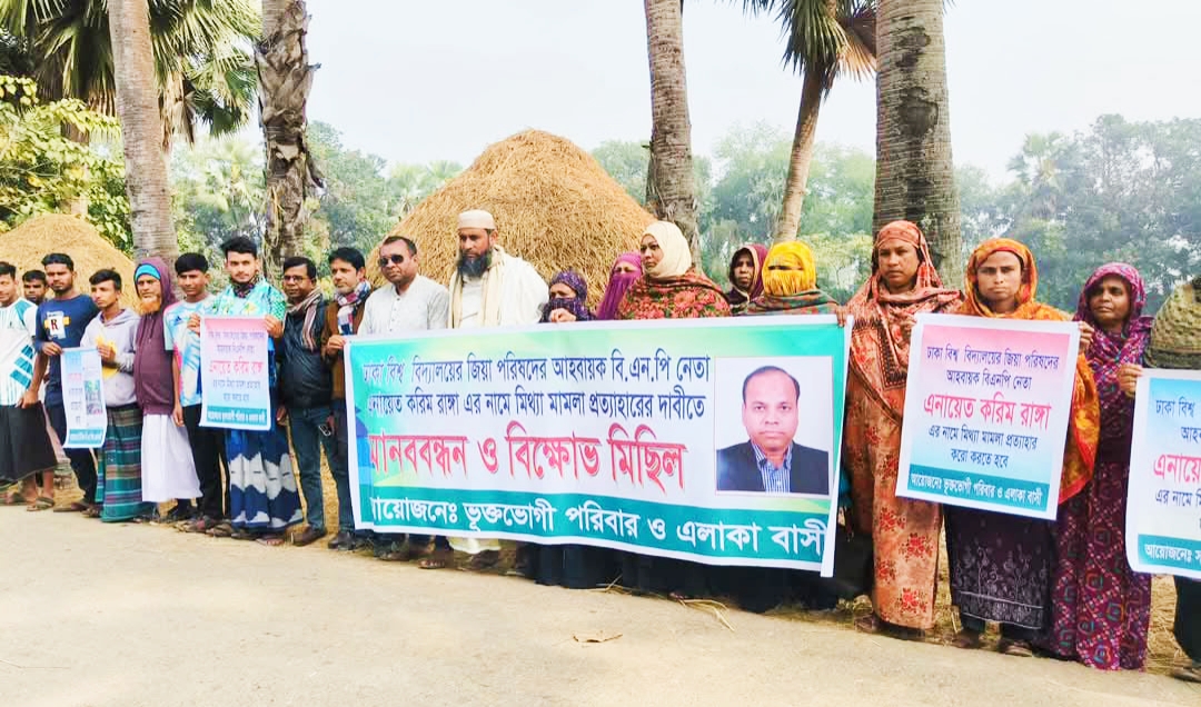 নাটোর প্রতিনিধি : নাটোরের সিংড়ায় বিএনপি নেতা এনায়েত করিম রাঙ্গার বিরুদ্ধে মিথ্যা ও ষড়যন্ত্রমূলক মামলা প্রত্যাহারের দাবিতে মানববন্ধন ও বিক্ষোভ হয়েছে।এনায়েত করিম রাঙ্গা ঢাকা বিশ্ববিদ্যালয় জিয়া পরিষদের সাবেক আহ্বায়ক। শনিবার দুপুরে উপজেলার বাঁশবাড়িয়া আঞ্চলিক সড়কে ঘন্টাব্যাপি এই কর্মসূচি পালন করেন এলাকার পাঁচ শতাধিক নারী-পুরুষ। মানববন্ধনে ডাহিয়া ইউনিয়ন বিএনপির যুগ্ম আহ্বায়ক আসাদুজ্জামান এর সভাপতিত্বে বক্তব্য দেন বিএনপি নেতা এনায়েত করিম রাঙ্গার সহধর্মিনী উম্মে সালমা, পাপিয়া উপজেলা বিএনপির আহ্বায়ক কমিটির সদস্য শরিফুল ইসলাম মৃধা, চৌগ্রাম ইউনিয়ন বিএনপি নেতা শের আলী, স্থানীয় শিক্ষক শরিফুল ইসলাম, গ্রাম্য প্রধান রইচ উদ্দিন, বাহার উদ্দিন বাচ্চু, ভুক্তভোগী পরিবারের সদস্য নাজমা বেগম, ছাত্রদল নেতা রবিউল করিম প্রমূখ। মানববন্ধনে বক্তারা বলেন, বিএনপি নেতা এনায়েত করিম রাঙ্গা বিএনপির একজন সক্রিয় কর্মী। তাছাড়া জুলাই-আগস্ট বিপ্লবে নিজের জীবন বাজি রেখে ঢাকার সভা-সমাবেশে অংশগ্রহণ করেন। কিন্তু পারিবারিক বিরোধের জের ধরে আপন ভাতিজা ছাত্রলীগ নেতা ফয়সাল আহমেদ নিজেকে সমন্বয়ক পরিচয় দিয়ে আপন চাচা রাঙ্গাকে ঢাকার সূত্রাপুর ও বণানী থানায় তিনটি হত্যা মামলায় জড়িয়ে দেন। আর ফয়সাল আহমেদ এর পিতা আবু জাহিদও স্থানীয় আওয়ামীলীগ নেতা। বাবা ও ছেলের সাবেক প্রতিমন্ত্রী জুনাইদ আহমেদ পলকের সাথে সখ্যতা ছিল। উল্লেখ্য, গত ২৮ ডিসেম্বর ঢাকার একটি হত্যা মামলায় বিএনপি নেতা রাঙ্গাকে তার নিজ গ্রামের বাড়ি সিংড়ার বাঁশবাড়িয়া থেকে সিংড়া থানা পুলিশ গ্রেফতার করেন।