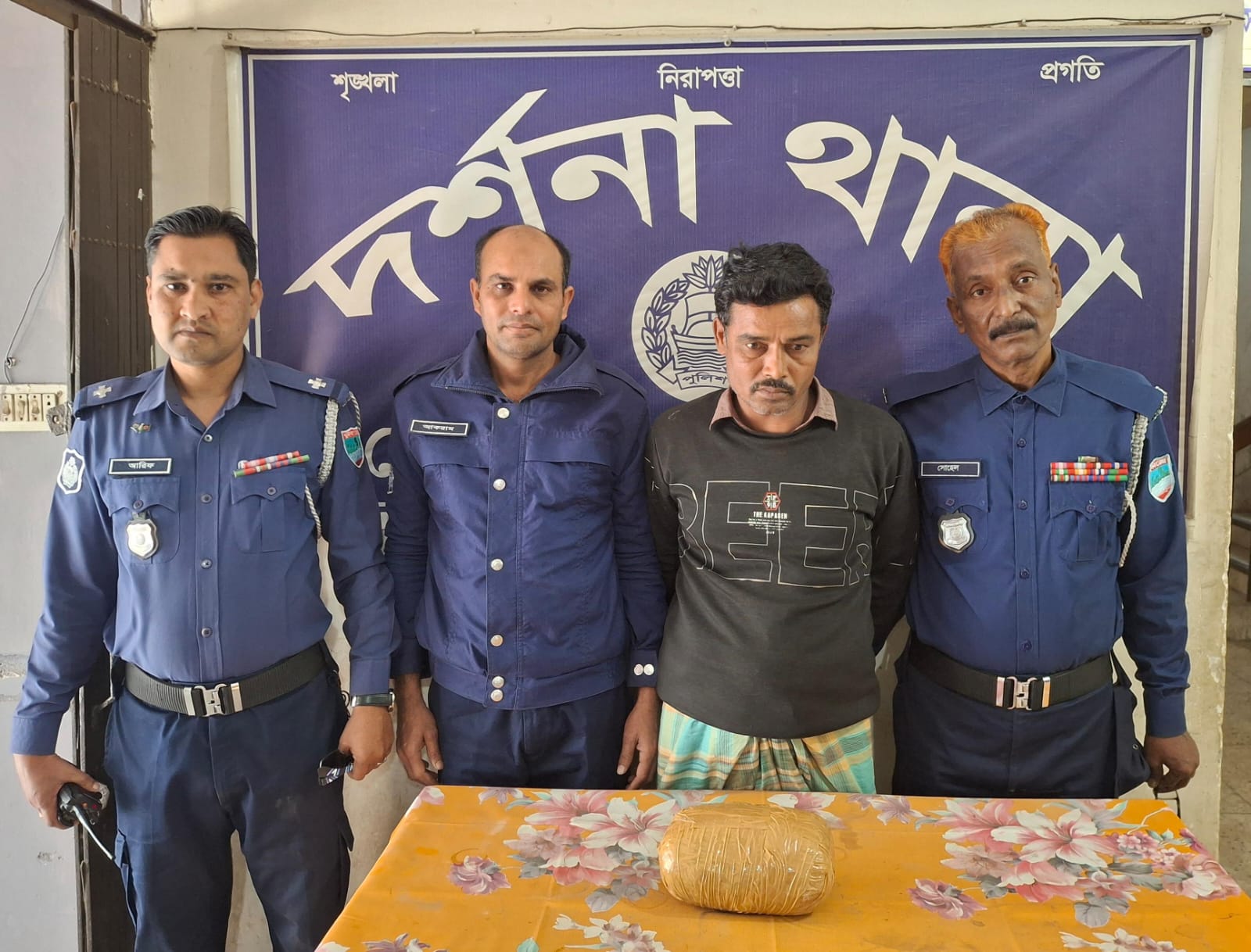 নিজস্ব প্রতিবেদক : দর্শনা থানা পুলিশ মাদক বিরোধী অভিযান চালিয়ে ১ কেজি গাঁজা ও মাদক বহন কাজে ব্যবহৃত একটি নছিমন গাড়ী জব্দ করেছে। সোমবার (১০ ফেব্রুয়ারী) বেলা সাড়ে ১২ টার সময় দর্শনা থানাধীন পরানপুর গ্রামস্থ দর্শনা পুরাতন বাজার টু পরানপুরগামী মেসার্স হাবলু ট্রেডার্স নামক মুদি দোকানের সামনে পাঁকা রাস্তার উপর থেকে তাকে আটক করা হয়। সূত্রে জানাগেছে, চুয়াডাঙ্গা পুলিশ সুপার খন্দকার গোলাম মওলা, বিপিএম-সেবা'র সার্বিক দিকনির্দেশনায় দর্শনা থানার অফিসার ইনচার্জ মুহম্মদ শহীদ তিতুমীর এর তত্ত্বাবধানে দর্শনা থানার এসআই মোঃ মাসুদুর রহমান সহ সঙ্গীয় অফিসার ও ফোর্স গোপন সংবাদের ভিত্তিতে মাদক বিরোধী অভিযান পরিচালনা করেন দর্শনা থানাধীন পরানপুর গ্রামস্থ দর্শনা পুরাতন বাজার টু পরানপুরগামী মেসার্স হাবলু ট্রেডার্স নামক মুদি দোকানের সামনে। এসময় পাঁকা রাস্তার উপর থেকে আটক করা হয় চন্ডিপুর গ্রামের আবুল বাশারের ছেলে মোঃ সুমন (৪২) কে। তার কাছ থেকে উদ্ধার করা হয় অবৈধ মাদকদ্রব্য ১ (এক) কেজি গাঁজা। যাহার অনুমান মূল্য ৩০ হাজার টাকা ও মাদক বহন কাজে ব্যবহৃত ১টি পুরাতন নছিমন গাড়ী, মূল্য অনুমান ৬০ হাজার টাকা। গ্রেফতারকৃত আসামীর বিরুদ্ধে দর্শনা থানায় মাদকদ্রব্য আইনে মামলা রুজু করা হয়েছে।