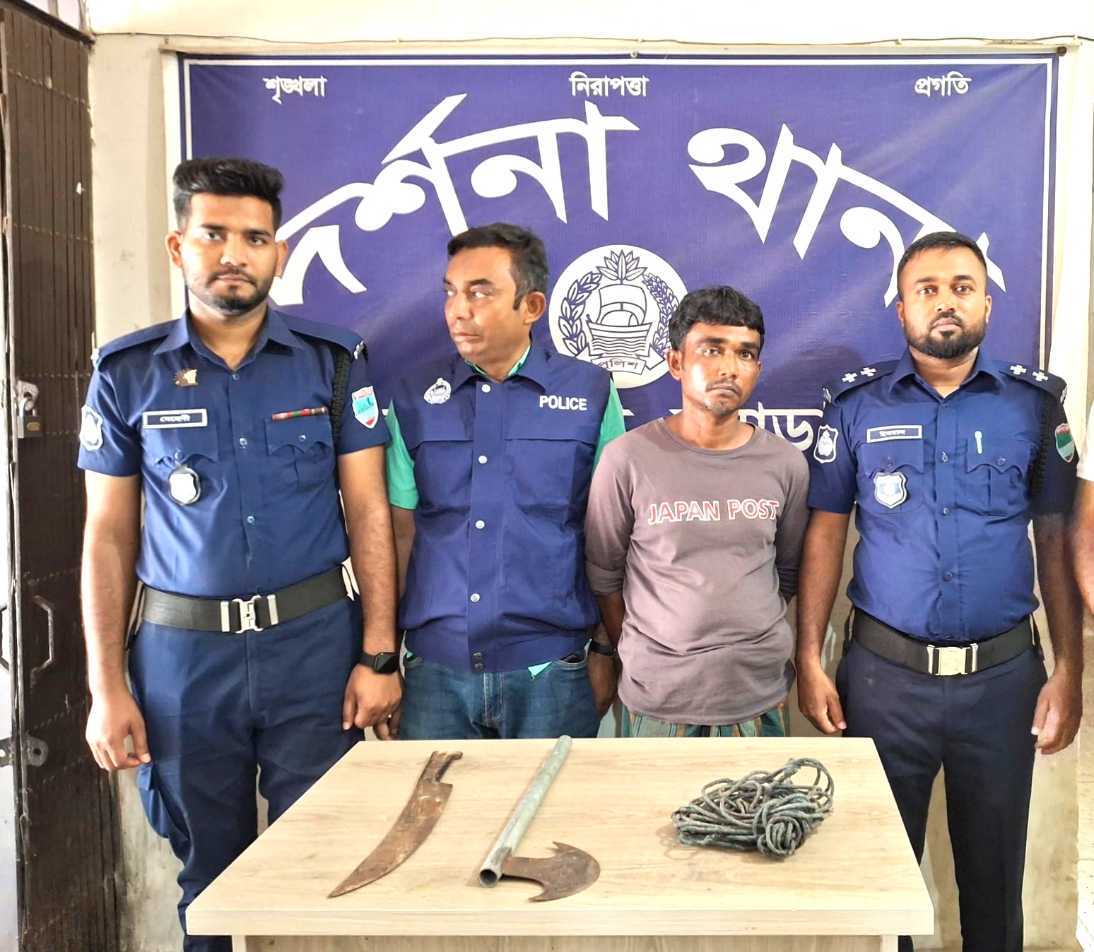 নিজস্ব প্রতিবেদক : দর্শনা থানা পুলিশ বিশেষ অভিযান চালিয়ে দস্যুতার প্রত্তুতিকালে একজনকে আটক করেছে। আটককৃতর কাছ থেকে উদ্ধার করা হয়েছে ১টি ধারালো ছুরি ও ১ টিচাইনিজ কুড়াল। রোববার (৬ এপ্রিল) বেলা সাড়ে ৩ ঘটিকার সময় দর্শনা থানাধীন পৌর এলাকার শান্তিপাড়া হইতে পরানপুর আবাসনগামী রাস্তার জনৈক আল আমিন এর চায়ের দোকানের সামনে পাকা রাস্তার উপর থেকে তাকে আটক করা হয়। সূত্রে জানাগেছে, চুয়াডাঙ্গা পুলিশ সুপার খন্দকার গোলাম মওলা, বিপিএম-সেবা'র সার্বিক দিকনির্দেশনায় দর্শনা থানার অফিসার ইনচার্জ মুহম্মদ শহীদ তিতুমীর এর তত্বাবধানে দর্শনা থানার এসআই (নিঃ) মোঃ মাসুদুর রহমান সহ সঙ্গীয় ফোর্স গোপন সংবাদের ভিত্তিতে বিশেষ অভিযান পরিচালনা করে দর্শনা থানাধীন শান্তিপাড়া গ্রামস্থ শান্তিপাড়া হইতে পরানপুর আবাসনগামী রাস্তার জনৈক আল আমিন এর চায়ের দোকানের সামনে। এসময় আটক করা হয় দর্শনা পৌর এলাকার দক্ষিণ চাঁদপুর হল্ট স্টেশনপাড়ার)শাহজাহান মন্ডল এর ছেলে ওয়াসীম মন্ডল (৩৫) কে তার কাছ থেকে উদ্ধার করা হয় ১টি ধারালো ছুরি, ১টি চাইনিজ কুড়াল ও ৪০ ফুট লম্বা রশি। এসময় ৩ জন আসামী ঘটনাস্থল হতে পালিয়ে যায়। গ্রেফতারকৃত আসামীর ও পলাতক আসামীদের বিরুদ্ধে দর্শনা থানায় নিয়মিত মামলা রুজু করা হয়েছে।