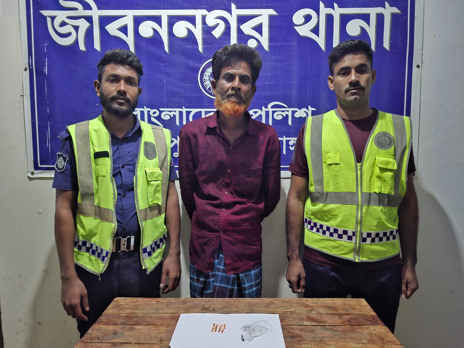 নিজস্ব প্রতিবেদক : জীবননগর থানাধীন শাহাপুর পুলিশ ক্যাম্প মাদক বিরোধী অভিযান চালিয়ে ২০ পিস ইয়াবা ট্যাবলেট সহ এক মাদক কারবারিকে আটক করেছে। বৃহস্পতিবার (১০ এপ্রিল) রাত ৯ টার দিকে জীবননগর থানাধীন আন্দুলবাড়ীয়া গ্রামস্থ্য দরগা চৌরাস্তা মোড়ে জনৈক ফজলু মন্ডল এর মুদি দোকানের সামনে পশ্চিম পার্শ্বে পাকা রাস্তার উপর থেকে তাকে আটক করা হয়। সূত্রে জানাগেছে, চুয়াডাঙ্গা পুলিশ সুপার খন্দকার গোলাম মওলা, বিপিএম-সেবা'র সার্বিক দিকনির্দেশনায় জীবননগর থানার অফিসার ইনচার্জ মামুন হোসেন বিশ্বাস এর নেতৃত্বে শাহাপুর পুলিশ ক্যাম্পের আইসি এসআই(নিঃ) মোঃ মেহেদী হাসান সহ সঙ্গীয় ফোর্স গোপন সংবাদের ভিত্তিতে মাদক বিরোধী অভিযান পরিচালনা করেন জীবননগর থানাধীন আন্দুলবাড়ীয়া গ্রামস্থ্য দরগা চৌরাস্তা মোড়ে জনৈক ফজলু মন্ডল এর মুদি দোকানের সামনে পশ্চিম পার্শ্বে পাকা রাস্তার উপর। এসময় আটক করা হয় আনছারবাড়ীয়া (স্টেশনপাড়ার)মৃত হায়দার আলীর ছেলে মোঃ তপু মিয়া (৫৫)কে, তার কাছ থেকে উদ্ধার করা হয় মাদকদ্রব্য ২০ পিস ইয়াবা ট্যাবলেট। গ্রেফতারকৃত আসামীর বিরুদ্ধে জীবননগর থানায় মাদকদ্রব্য আইনে মামলা রুজু করা হয়েছে।