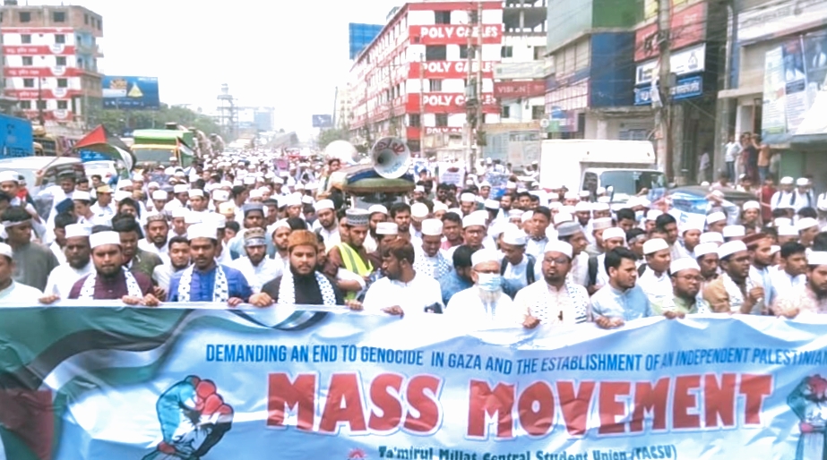 গাজায় ইসরায়েলি গণহত্যার প্রতিবাদে টঙ্গীতে তা’মীরুল মিল্লাত শিক্ষার্থীরদের বিক্ষোভ মিছিল