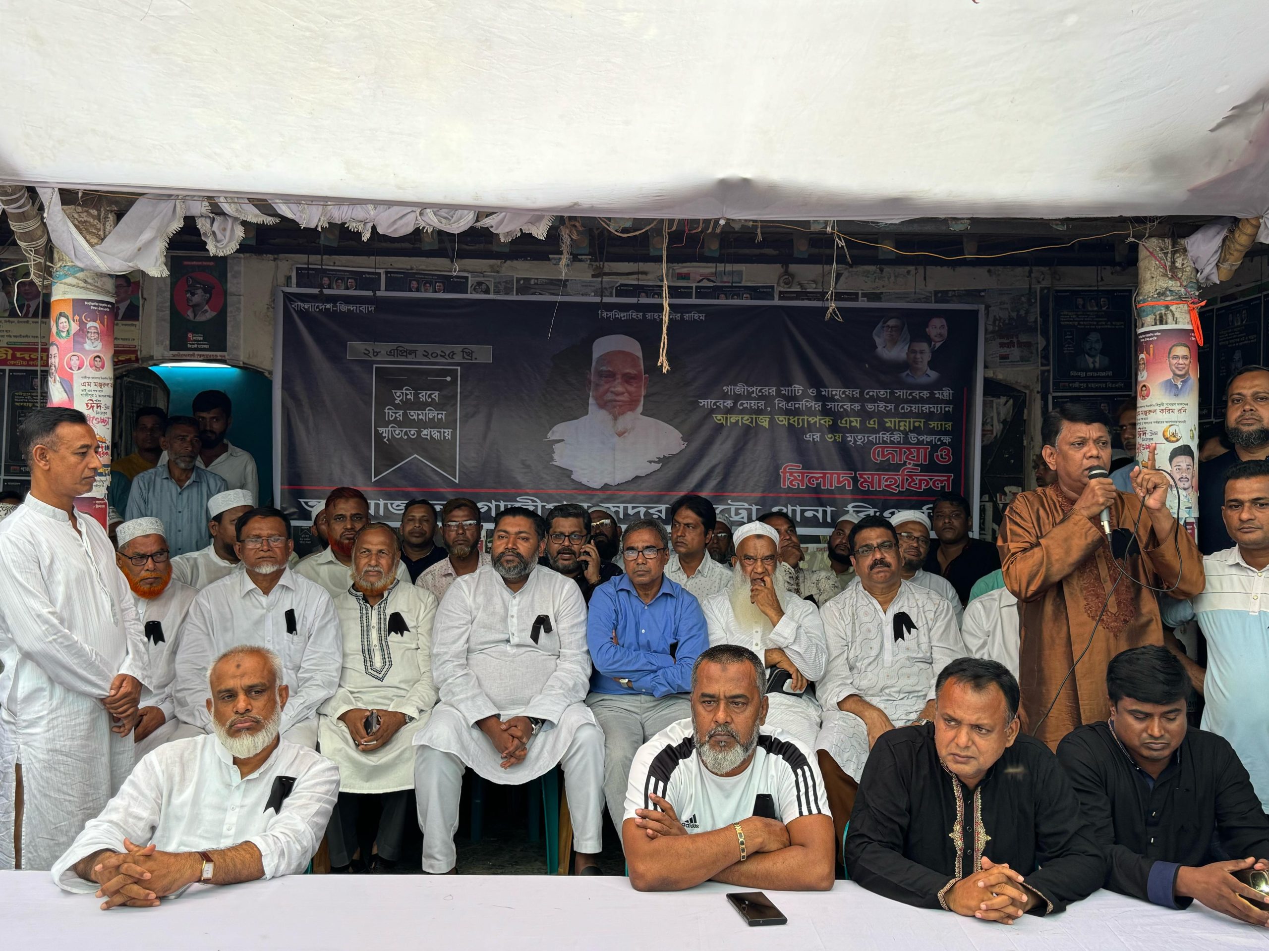 নিজস্ব প্রতিবেদক : গাজীপুরের সিটি করপোরেশনের সাবেক মেয়র, সাবেমক মন্ত্রী আলহাজ্ব অধ্যাপক এম. এ মান্নানের ৩য় মৃত্যুবার্ষিকী উপলক্ষে গাজীপুর মহানগর বিএনপি ও ও অঙ্গ সংগঠনের উদ্যোগে মিলাদ ও দোয়া অনুষ্ঠিত হয়েছে। সোমবার (২৮ এপ্রিল) দুপুরে গাজীপুরের সিটি করপোরেশনের সাবেক মেয়র, সাবেমক মন্ত্রী আলহাজ্ব অধ্যাপক এম. এ মান্নানের ৩য় মৃত্যুবার্ষিকী উপলক্ষে সদর মেট্রো থানা বিএনপি আয়োজনে দলীয় কার্যালয়ে দোয়া ও মিলাদ মাহফিল অনুষ্ঠিত হয়। এর আগে পুবাইল মেট্রো থানা বিএনপি'র আয়োজনে দোয়া ও মিলাদ মাহফিল অনুষ্ঠিত হয়। এতে প্রধান অতিথি হিসেবে উপস্থিত ছিলেন গাজীপুর জেলা বিএনপি'র আহ্বায়ক ফজলুল হক মিলন এবং বিশেষ অতিথি হিসেবে উপস্থিত ছিলেন গাজীপুর মহানগর বিএনপি'র সাধারণ সম্পাদক এম মঞ্জুরুল করিম রনি। এছাড়াও উপস্থিত ছিলেন গাজীপুর জেলা বিএনপি ও পুবাইল মেট্রো থানা বিএনপি'র অঙ্গ ও সহযোগী সংগঠনের অন্যান্য নেতৃবৃন্দ। সকালে গাজীপুর মহানগর যুবদলের আয়োজনে ফ্রি মেডিকেল ক্যাম্প রক্তদান কর্মসূচী অনুষ্ঠিত হয়। এতে প্রধান অতিথি হিসেবে উপস্থিত ছিলেন গাজীপুর মহানগর বিএনপি'র সভাপতি শওকত হোসেন সরকার ও গাজীপুর মহানগর যুবদলের সদস্য সচিব মাহমুদ হাসান রাজু। এছাড়াও উপস্থিত ছিলেন গাজীপুর মহানগর বিএনপি'র অঙ্গ ও সহযোগী সংগঠনের অন্যান্য নেতৃবৃন্দ। সদর থানা বিএনপির আয়োজিত দোয়ার অনুষ্ঠানে গাজীপুর মহানগর বিএনপির সভাপতি শওকত হোসেন সরকার প্রধান অতিথির বক্তব্যে বলেন অধ্যাপক মান্নানকে নিয়ে এতো অল্প সময়ে তার ব্যাপ্তি বলা সম্ভব না, যারা তাকে সর্বোচ্চ ভোট পেয়ে নির্বাচিত হয়েও কেন তিনি কাজ করতে পারলেন না এর পেছনে কাদের হাত রয়েছে তাদের খুঁজে বের করে শাস্তির আওতায় আনার দাবী জানান। তার নামে রাস্তার নাম করনের দাবি জানান। এছাড়াও তার মতো নির্যাতিত নেতাকে কারা মৃত্যুর মুখে ঠেলে দিয়েছে তাদের খুঁজে বের করে শাস্তির দাবি জানিয়েছেন।