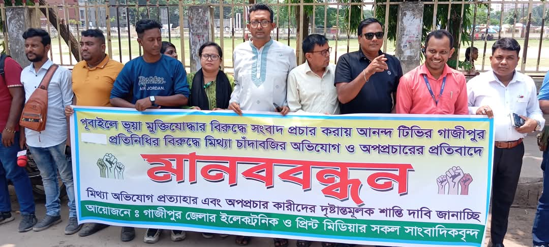 গাজীপুরে আনন্দ টিভির সাংবাদিক শাকিলের বিরুদ্ধে মিথ্যা অভিযোগের প্রতিবাদে সাংবাদিকদের মানববন্ধন