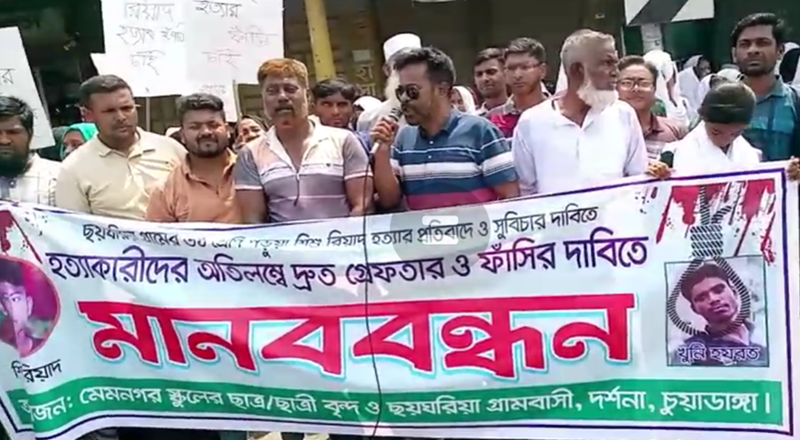 নিজস্ব প্রতিবেদক : চুয়াডাঙ্গার দামুড়হুদা উপজেলার ছয়ঘরিয়া গ্রামে ষষ্ঠ শ্রেনীর স্কুলছাত্র রিয়াদ (১৪) হত্যা মামলার আসামীদের ফাসির দাবিতে মানববন্ধন করেছে রিয়াদের সহকর্মি ছাত্র-ছাত্রী, শিক্ষক ও এলাকাবাসী। বুধবার ১৪ মে দুপুর ১২ টায় আসামীদের বাড়ির সামনে দাড়িয়ে এ কর্মসূচি পালন করে। মানববন্ধনে বক্তব্য দর্শনা পৌর বি এন পির সমন্বয় কমিটির সদস্য মোঃ নাহারুল মাস্টার,পারকৃষ্ণপুর-মদনা ইউনিয়ন বিএনপি'র সভাপতি মোঃ শফিউল্লাহ, মেমনগর বিডি মাধ্যমিক বিদ্যালয়ের ভারপ্রাপ্ত প্রধান শিক্ষক মোঃ একরামুল হোসেন,স্কুলের ছাত্রছাত্রী সহ স্থানীয়রা । বক্তারা স্কুল ছাত্র রিয়াদ হত্যার সাথে জড়িতদের অতিদ্রুত আটক পুর্বক ফাঁসির দাবি জানান। উল্লেখ গত সোমবার ১২ মে দুপুরে উপজেলার ছয়ঘরিয়া গ্রামে দুটি পরিবারের মধ্যে কথাকাটাকাটি হয়। পরে বাইতুল্লার ছেলে মোঃ হযরত আলির কাছে থাকা ধারালো হাসুয়া দিয়ে জিয়াউর রহমান কাজির ছেলে ষষ্ঠ শ্রেনীর ছাত্র রিয়াদ হোসেন (১৪) কে দিনের বেলায় প্রকাশ্যে কুপিয়ে হত্যা করে। এ ঘটনায় মঙ্গলবার ১৩ মে ৫ জনকে আসামী করে দর্শনা থানায় হত্যা মামলা দায়ের করে নিহত স্কুল ছাত্রের পিতা। দর্শনা থানার ওসি মোঃ শহিদ তিতুমির জানান ইতিমধ্যে দুজনকে আ্টক করা হয়েছে,বাকি আসামি ধরার চেস্টা চলছে।
