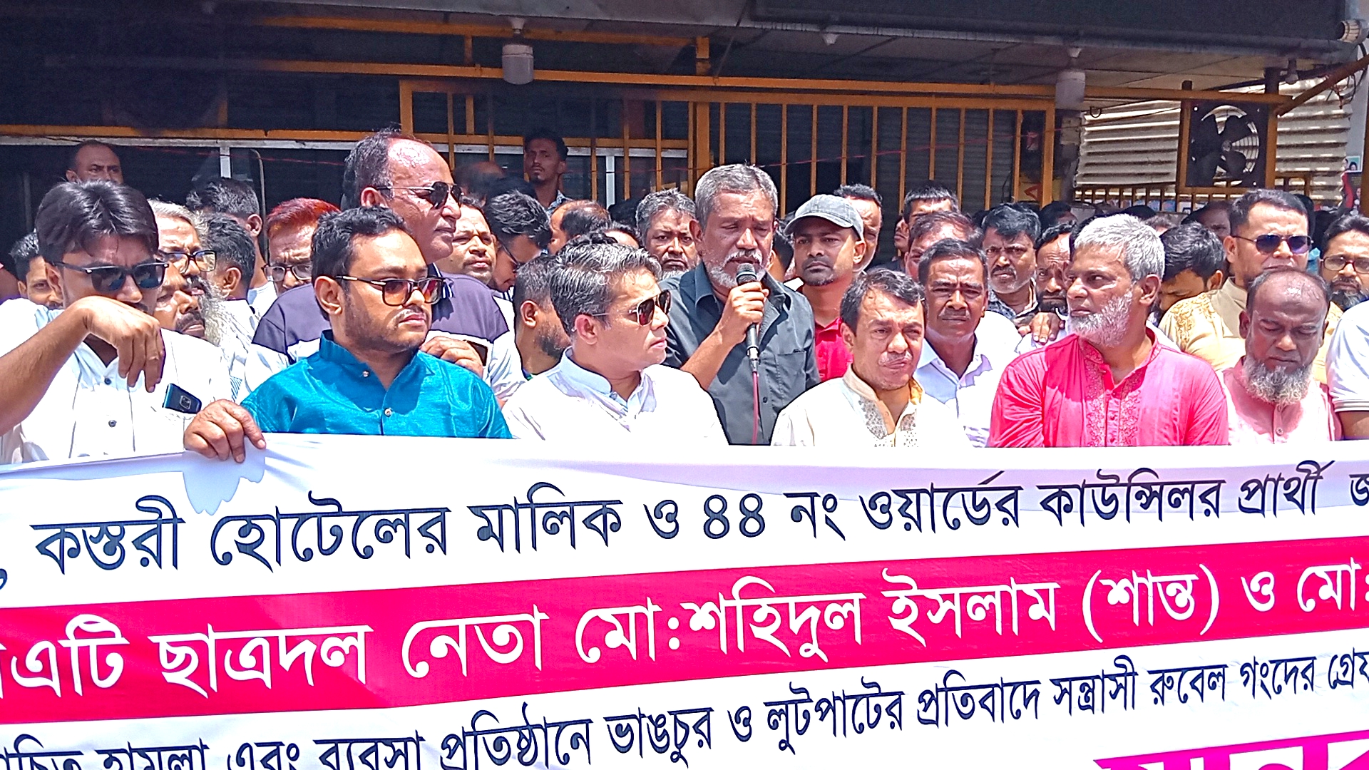 নিজস্ব প্রতিবেদক : গাজীপুর মহানগরের টঙ্গীর টিএনটি বাজারে বিএনপি নেতা কস্তুরী হোটেলের মালিক ও ৪৪ নং ওয়ার্ডের কাউন্সিলর পদপ্রার্থী দুলাল হোসেনের দুই পুত্র আই ইউ বি এটি ছাত্রদল নেতা শহিদুল ইসলাম শান্ত ও শফিকুল ইসলাম শুভ এর উপর বর্বরচিত হামলা এবং প্রতিষ্টান ভাঙচুর ও লুটপাটের প্রতিবাদে সন্ত্রাসী রুবেল গংদের গ্রেফতার ও দৃষ্টান্তমূলক শাস্তির দাবিতে প্রতিবাদ সভা ও মানববন্ধন অনুষ্ঠিত হয়েছে। শুক্রবার (২৩মে) সকাল ১০টায় আয়োজিত এ মানববন্ধনে অংশগ্রহণ করেন টিএনটি বাজার ব্যবসায়ী মালিক সমিতি ও ৪৪ নং ছাত্র জনতা সহ সর্বস্তরের জনগণ ও বিএনপি নেতাকর্মীরা। মানববন্ধনে বক্তারা বলেন, শেখ হাসিনা বিদায় নিলেও তার দোসররা এখনো সক্রিয় রয়েছে। এই দোসররাই বিএনপি নেতা দুলাল হোসেনের দুই ছেলে শান্ত ও শুভকে কুপিয়ে জখম করে এবং তাঁদের ব্যবসা প্রতিষ্ঠান 'কস্তুরী হোটেল' লুটপাট করে চরম অরাজকতা সৃষ্টি করেছে। তারা এই ঘটনার তীব্র নিন্দা ও প্রতিবাদ জানান এবং দ্রুত সন্ত্রাসীদের গ্রেফতার ও দৃষ্টান্তমূলক শাস্তির দাবি করেন। বক্তারা আরও বলেন, অন্তর্বর্তীকালীন সরকার যেন ডিসেম্বরের মধ্যে অতি দ্রুত সময়ে একটি অবাধ, সুষ্ঠু ও নিরপেক্ষ নির্বাচন সম্পন্ন করে জনগণের মনোনীত সরকার প্রতিষ্ঠা করে দেশের স্থিতিশীলতা ফিরিয়ে আনে।
