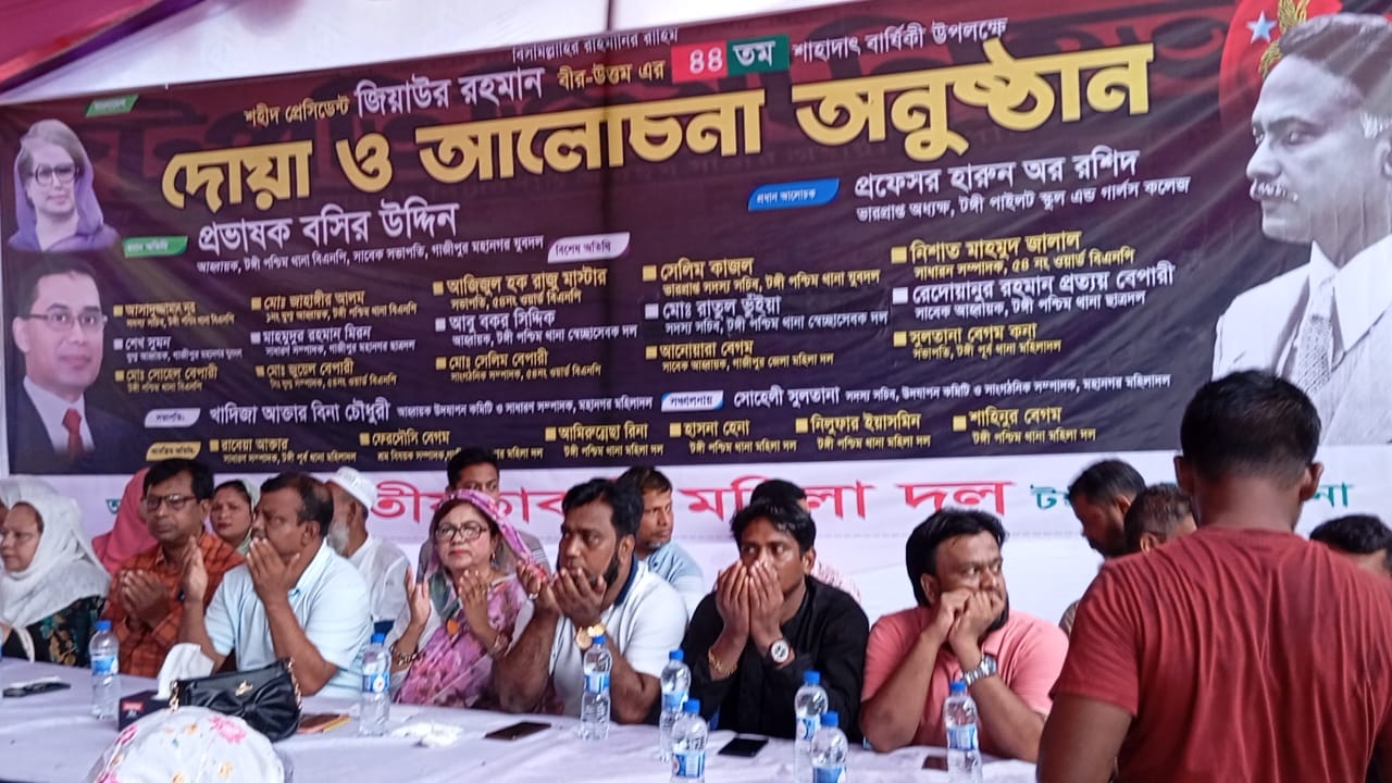 নিজস্ব প্রতিবেদক : টঙ্গীতে শহিদ প্রেসিডেন্ট জিয়াউর রহমানের ৪৪তম শাহাদৎ বার্ষিকী উপলক্ষে দোয়া ও আলোচনা সভা অনুষ্ঠিত হয়েছে। টঙ্গী পশ্চিম থানা মহিলা দলের আয়োজনে বৃহস্পতিবার (২৯ মে) সকাল সাড়ে ১০ ঘটিকার সময় টঙ্গী পশ্চিম থানার আহবায়ক প্রভাষক বশির উদ্দিনের টঙ্গীস্থ আউচপাড়া বাসভবনে এই দোয়া ও আলোচনা সভা অনুষ্ঠিত হয়। গাজীপুর মহিলা দলের সাধারণ সম্পাদক খাদিজা আক্তার বিনা চৌধুরী'র সভাপতিত্ব প্রধান অতিথি হিসেবে উপস্থিত ছিলেন টঙ্গী পশ্চিম থানা আহবায়ক প্রভাষক বসির উদ্দিন,গাজীপুর মহিলা দলের সংগঠনিক সম্পাদক সোহেলী সুলতানের সঞ্চালনায় আরো উপস্থিত ছিলেন গাজীপুর মহানগর যুবদলের যুগ্ন আহবায়ক শেখ সুমন, টঙ্গী পশ্চিম থানা স্বেচ্ছাসেবক দলের সদস্য সচিব রাতুল ভুঁইয়া, টঙ্গী পশ্চিম থানা ছাত্রদলের সাবেক আহ্বায়ক রেদোয়ানুর রহমান প্রত্যয় বেপারী, ৫৪ নং ওয়ার্ড বিএনপির সভাপতি আজিজুল হক রাজু মাস্টার, সাধারণ সম্পাদক নিশাত মাহমুদ জালাল, যুগ্ম সাধারণ সম্পাদক সাগর হোসেন, সাংগঠনিক সম্পাদক সেলিম বেপারী, গাজীপুর মহানগর মহিলা দলের ব্রহ্ম বিষয়ের সম্পাদক ফেরদৌসি বেগম, টঙ্গী পূর্ব থানা মহিলা দলের সাধারণ সম্পাদক রাবেয়া আক্তার, টঙ্গী পশ্চিম থানা মহিলাদলের আমিরুন্নেসা রিনা হাসনাহেনা নিলুফার ইয়াসমিন শাহিনুর বেগম প্রমুখ। আলোচনা শেষে শহীদ রহমানের স্মরণে দোয়া করা হয়।