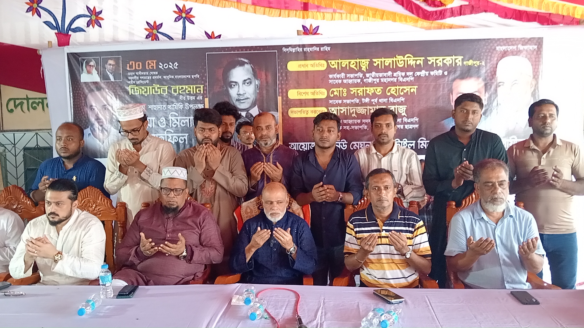 নিজস্ব প্রতিবেদক : গাজীপুর সিটি কর্পোরেশনের টঙ্গী ৪৭ নং ওয়ার্ডে মহান স্বাধীনতার ঘোষক বহুদলীয় গণতন্ত্রের প্রবর্তক ও আধুনিক বাংলাদেশের স্থপতি শহিদ রাষ্ট্রপতি জিয়াউর রহমানের ৪৪তম শাহাদৎ বার্ষিকী উপলক্ষে দোয়া ও আলোচনা সভা অনুষ্ঠিত হয়েছে। নিউ মেঘনা টেক্সটাইল মিল কতৃপক্ষ ও ব্যাবসায়ীদের আয়োজনে রোববার (১ জুন) বাদ জোহর মরকুন তিস্তাগেট ইউনাইটেড মডেল একাডেমী মাঠ প্রাঙ্গণে এই আলোচনা ও দোয়া মাহফিল অনুষ্ঠিত হয়। গাজীপুর মহানগর ছাত্রদলের প্রতিষ্ঠাতা সহ-সভাপতি ও টঙ্গী পূর্ব থানা বিএনপি'র আহবায়ক সদস্য আসাদুজ্জামান রাজু'র সভাপতিতে প্রধান অতিথি হিসেবে উপস্থিত ছিলেন বাংলাদেশ জাতীয়তাবাদী কেন্দ্রীয় শ্রমিক দলের কার্যকরি সভাপতি আলহাজ্ব সালাউদ্দিন সরকার, বিশেষ অতিথি হিসেবে উপস্থিত ছিলেন টঙ্গী পর্ব থানা সাবেক সভাপতি সরাফত হোসেন, গাজীপুর মহানগর যুবদলের প্রতিষ্ঠাতা সাধারণ সম্পাদক জসিম উদ্দিন ভাট, টঙ্গী পূর্ব থানা বিএনপির সাবেক সাংগঠনিক সম্পাদক জসিম দেওয়ান, সাবেক ছাত্রনেতা পারভেজ আলম এর উপস্থাপনায় আরো উপস্থিত ছিলেন টঙ্গী পূর্ব থানা শ্রমিক দলের আহ্বায়ক এস এম জাহাঙ্গীর আলম, ৪৮ নং ওয়ার্ড বিএনপি'র সভাপতি নাজিম হোসেন, অনুষ্ঠানটির সার্বিক তত্ত্বাবধানে ছিলেন ব্যবসায়ী মফিজুল ইসলাম, খোকন শেখ, নজরুল ইসলাম, সিদ্দিকুর রহমান, নজরুল ইসলাম, নিলু হারুন অর রশিদ,এসময় আরো উপস্থিত ছিলেন টঙ্গী পূর্ব থানা ছাত্রদলের সাধারণ সম্পাদক পদপ্রার্থী মোঃ আল রাব্বি, টঙ্গী সরকারি কলেজ ছাত্রদলের সাধারণ সম্পাদক পদপ্রার্থী কামরুল হাসান সায়েম প্রমুখ। আলোচনা শেষে শহীদ জিয়াউর রহমানের স্মরণে দোয়া করা হয়।