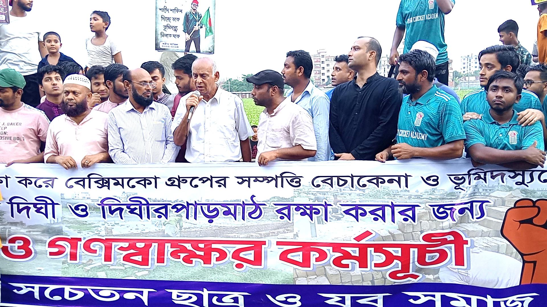 নিজস্ব প্রতিবেদক : গাজীপুর সিটি কর্পোরেশনের ৪৮ নং ওয়ার্ডের দত্তপাড়া দিঘীরপাড় খেলার মাঠ ভূমিদস্যুদের হাত থেকে রক্ষা করতে মানববন্ধন ও গনস্বাক্ষর কর্মসূচি অনুষ্ঠিত হয়েছে । শুক্রবার (১৮ জুলাই) বিকাল ৪ ঘটিকার সময় টঙ্গীস্থ দিঘীরপাড় এলাকায় এই মানববন্ধন ও গনস্বাক্ষর কর্মসুচি অনুষ্ঠিত হয়। স্থানীয় সচেতন ছাত্র ও যু্ব সমাজের উদ্যোগে উক্ত কর্মসূচিতে অংশগ্রহণ করেন অত্র এলাকার শিশু, কিশোর, যুবক, আবাল- বৃদ্ধ-বনিতা সহ সকল শ্রেণী পেশার মানুষ । শিশুদের স্লোগান ছিল আমরা স্কুল/মাদ্রাসার ছাত্র আমরা খেলবো কোথায়, আমরা খেলার মাঠ ফেরত চাই। বেক্সিমকো এক্সপোর্ট ইমপোর্ট কোম্পানির নিষেধাজ্ঞা অমান্য করে একটি ভূমিদস্যু চক্র দীর্ঘদিন ধরে এলাকার খেলার মাঠটি দখল করে নিয়েছে বলে মানববন্ধনে অভিযোগ তোলে। সরকার ও রাষ্ট্রের কাছে এই অবৈধ দখলদারিত্ব বন্ধে এবং অবৈধ জমি বেচাকেনা বন্ধে সংশ্লিষ্ট দপ্তরের দ্রুত হস্তক্ষেপ কামনা করেছেন। এসময় উপস্থিত দত্তপাড়া এলাকার বাসিন্দারা জানান, এই খেলার মাঠটি তাদের দীর্ঘদিনের ঐতিহ্য বহন করে। স্থানীয় শিশু-কিশোর ও যুবকদের খেলাধুলা এবং সুস্থ বিনোদনের জন্য এই মাঠটি অত্যন্ত গুরুত্বপূর্ণ। কিন্তু একটি ভূমিদস্যু চক্র ক্ষমতার অপব্যবহার করে মাঠটি অবৈধভাবে দখল করে নিয়েছে, যার ফলে এলাকার যুব সমাজ খেলাধুলার সুযোগ থেকে বঞ্চিত হচ্ছে। আন্দোলনকারীরা বেক্সিমকো এক্সপোর্ট ইমপোর্ট কোম্পানির নিষেধাজ্ঞা থাকা সত্ত্বেও ভূমিদস্যুদের এই বেপরোয়া কর্মকাণ্ডের তীব্র নিন্দা জানিয়েছেন। তারা অবিলম্বে মাঠটি দখলমুক্ত করে পূর্বের অবস্থায় ফিরিয়ে আনার দাবি জানান। এছাড়া, অবৈধভাবে জমি কেনাবেচার সাথে জড়িতদের বিরুদ্ধে কঠোর আইনানুগ ব্যবস্থা গ্রহণের জন্য প্রশাসনের প্রতি আহবান জানিয়েছেন। এই ঘটনায় স্থানীয়দের মধ্যে তীব্র ক্ষোভ বিরাজ করছে। এ সময় উপস্থিত ছিলেন আলমগীর হোসেন দিপু, বীর মুক্তিযোদ্ধা খলিলুর রহমান, গাজীপুর সেন্ট্রাল প্রেসক্লাবের সভাপতি আব্দুল ওহাব রিন্তু, শামীম, আল মামুন, সজীব, আহমেদ, বাদল আহমেদ, বান্নি সহ টঙ্গী সচেতন ছাত্র ও যুব সমাজ। এসময় উপস্থিত নেতৃবৃন্দরা হুঁশিয়ারি দিয়ে বলেন, যদি দ্রুত এই বিষয়ে কোনো পদক্ষেপ না নেওয়া হয়, তাহলে তারা আরও বৃহত্তর আন্দোলন কর্মসূচিতে যাওয়া হবে।