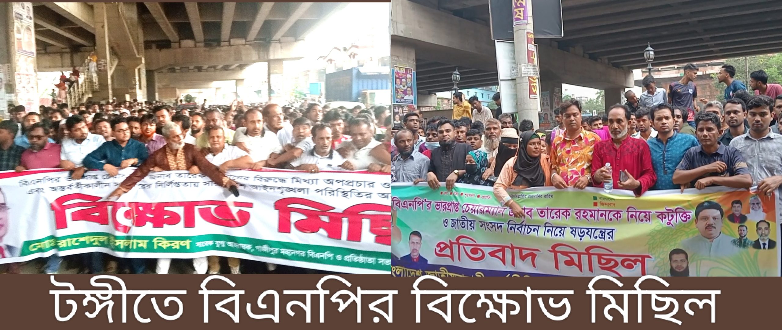 নিজস্ব প্রতিবেদক : বিএনপির বিরুদ্ধে চলমান ষড়যন্ত্র এবং দলের ভারপ্রাপ্ত চেয়ারম্যান তারেক রহমানের বিরুদ্ধে অপপ্রচার ও বিভ্রান্তি এবং অন্তর্বতীন কালীন সরকারের নির্লিপ্ততায় সারাদেশে আইন-শৃঙ্খলা পরিস্থিতির অবনতির প্রতিবাদেবিক্ষোভ মিছিল অনুষ্ঠিত হয়েছে। গাজীপুর মহানগর বিএনপির সভাপতি মোঃ শওকত হোসেন সরকারের নির্দেশে শনিবার (১৯ জুলাই) বিকেলে টঙ্গী আশরাফ সেতু কমপ্লেক্সের সামনে থেকে বিক্ষোভ মিছিল বের হয়। মিছিলটি ঢাকা-ময়মনসিংহ মহাসড়ক প্রদক্ষিণ করে ষ্টেশন রোডে এসে সংক্ষিপ্ত আলোচনার মাধ্যমে শেষ হয়। গাজীপুর মহানগর বিএনপি'র সাবেক যুগ্ম আহবায়ক ও টঙ্গী পূর্ব থানা বিএনপি'র প্রতিষ্ঠাতা সভাপতি মোঃ রাশিদুল ইসলাম কিরণের আয়োজিত এই অনুষ্ঠানে উপস্থিত ছিলেন গাজীপুর মহানগর বিএনপির সাবেক দপ্তর সম্পাদক মোঃ আব্দুর রহিম খান (কালা) টঙ্গী পূর্ব থানা যুবদলের সদস্য সচিব নাজমুল হোসেন মন্ডল, গাজীপুর মহানগর বিএনপির সাবেক সহ আইন বিষয়ক সম্পাদক এডভোকেট শহিদুল ইসলাম,টঙ্গী পূর্ব থানা বিএনপি'র সাবেক সাংগঠনিক সম্পাদক আলহাজ্ব জাহাঙ্গীর আলম ভেন্ডার, টঙ্গি পূর্ব থানা বিএনপির সাংগঠনিক সম্পাদক বিল্লাল হোসেন সানি , বিএনপি নেতা, আবু বক্কর সিদ্দিক কবির ,গাজী ওমর ফারুক, সালাউদ্দিন খোকন, সাইফুল ইসলাম শাহীন,বাবুল হোসেন চৌধুরী,গাজীপুর মহানগর কর্মজীবি দলের সভাপতি আইয়ুব খাঁন, কার্যকরী সভাপতি মনিরুজ্জামান মাষ্টার, বিএনপি নেতা মোঃ মনির হোসেন, যুবদল নেতা, মোঃ মশিউর রহমান, মোঃ হারুনুর রশিদ, মোঃ সালাহউদ্দিন, মোঃ শাহাবুদ্দিন, মোঃ আল কাশ, মোঃ নুরু, মোঃ সজিব, মোঃ রুবেল মিয়া যুবদল নেতা হাবিব মোল্লা প্রমুখ।