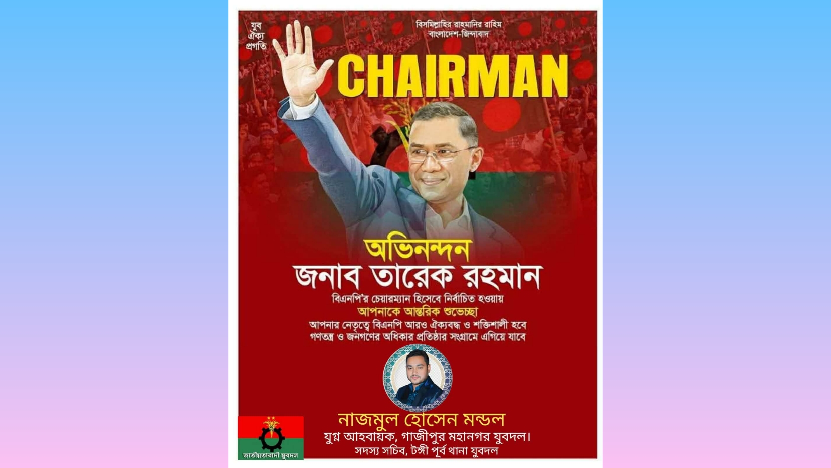 নিউজ ডেক্স : বাংলাদেশ জাতীয়তাবাদী দল (বিএনপি)-এর চেয়ারম্যান হিসেবে নির্বাচিত হওয়ায় তারেক রহমান-কে আন্তরিক শুভেচ্ছা ও অভিনন্দন জানিয়েছে গাজীপুর মহানগর যুবদলের যুগ্ম আহ্বায়ক ও টঙ্গী পূর্ব থানা যুবদলের সদস্য সচিব নাজমুল হোসেন মন্ডল। তিনি জানান, আপনার সুযোগ্য, দূরদর্শী ও বলিষ্ঠ নেতৃত্বে বাংলাদেশ জাতীয়তাবাদী দল আরও সুসংগঠিত, ঐক্যবদ্ধ ও শক্তিশালী রাজনৈতিক শক্তিতে পরিণত হবে এই দৃঢ় বিশ্বাস আমাদের। গণতন্ত্র পুনরুদ্ধার, মানুষের ভোটাধিকার প্রতিষ্ঠা, আইনের শাসন নিশ্চিতকরণ এবং দেশ ও জাতির ন্যায্য অধিকার আদায়ের সংগ্রামে আপনার নেতৃত্ব বিএনপিকে নতুন দিশা দেখাবে বলে আমরা প্রত্যাশা করি স্বৈরাচারবিরোধী আন্দোলন, গণতান্ত্রিক মূল্যবোধ রক্ষা এবং সাধারণ মানুষের আশা-আকাঙ্ক্ষা বাস্তবায়নে আপনার প্রজ্ঞা, সাহসিকতা ও রাজনৈতিক প্রজ্ঞা গুরুত্বপূর্ণ ভূমিকা রাখবে এটাই আমাদের দৃঢ় বিশ্বাস। আপনার নেতৃত্বে বিএনপি দেশপ্রেমিক শক্তিকে আরও ঐক্যবদ্ধ করে একটি গণতান্ত্রিক, ন্যায়ভিত্তিক ও সমৃদ্ধ বাংলাদেশের পথে এগিয়ে যাবে ইনশাআল্লাহ। আপনার সুস্বাস্থ্য, দীর্ঘায়ু ও সর্বাঙ্গীন সাফল্য কামনা করছি। মহান আল্লাহ আপনাকে দেশ ও জাতির কল্যাণে আরও কার্যকর ভূমিকা রাখার তৌফিক দান করুন এই দোয়া রইল।