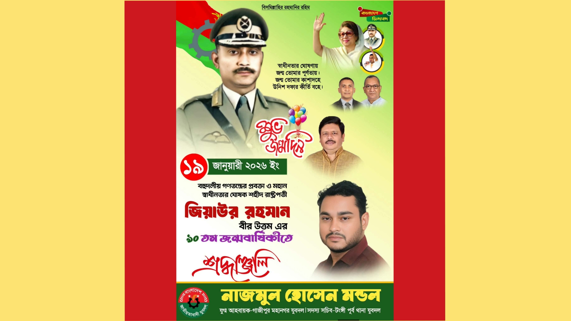 নিজস্ব প্রতিবেদক : বাংলাদেশের স্বাধীনতার ঘোষক, বহুদলীয় গণতন্ত্রের প্রবর্তক ও শহিদ রাষ্ট্রপতি জিয়াউর রহমানের ৯০তম জন্মদিন উপলক্ষে গভীর শ্রদ্ধা ও ভালোবাসা জানিয়েছেন গাজীপুর মহানগর যুবদলের যুগ্ম আহ্বায়ক এবং টঙ্গী পূর্ব থানা যুবদলের সদস্য সচিব নাজমুল হোসেন মন্ডল। এক বিবৃতিতে তিনি বলেন, শহিদ জিয়াউর রহমান ছিলেন একজন দূরদর্শী রাষ্ট্রনায়ক, যিনি স্বাধীনতা-পরবর্তী বাংলাদেশকে আত্মনির্ভরশীল ও শক্তিশালী রাষ্ট্র হিসেবে গড়ে তুলতে অগ্রণী ভূমিকা পালন করেছেন। তাঁর সততা, দেশপ্রেম ও নেতৃত্বগুণ আজও তরুণ সমাজের জন্য অনুকরণীয় ও প্রেরণার উৎস। নাজমুল হোসেন মন্ডল আরও বলেন, শহিদ জিয়ার আদর্শ ধারণ করেই যুবদল ও বিএনপির নেতাকর্মীরা গণতন্ত্র, ভোটাধিকার এবং জনগণের ন্যায্য অধিকার প্রতিষ্ঠায় নিরলসভাবে কাজ করে যাচ্ছে। বর্তমান প্রজন্মকে তাঁর দেশপ্রেম ও আত্মত্যাগের ইতিহাস জানতে হবে এবং সেই আদর্শ বাস্তবায়নে এগিয়ে আসতে হবে। তিনি শহিদ রাষ্ট্রপতি জিয়াউর রহমানের রুহের মাগফিরাত কামনা করেন এবং তাঁর স্মৃতির প্রতি গভীর শ্রদ্ধা নিবেদন করেন।