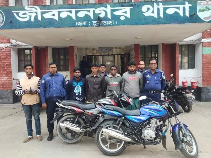 নিজস্ব প্রতিবেদক : জীবননগর থানা পুলিশ বিশেষ অভিযান চালিয়ে আন্তঃ জেলা মোটরসাইকেল চোরচক্রের সক্রিয় ৪ জন চোরক আটক করেছে। শুক্রবার (৯ ফেব্রুয়ারী) সকাল থেকে অভিযান পরিচালনা করে তাদেরকে আটক করা হয়। সুত্রে জানাগেছে, চুয়াডাঙ্গা পুলিশ সুপার আর এম ফয়জুর রহমান, পিপিএম-সেবা এর সার্বিক দিকনির্দেশনায় চুয়াডাঙ্গা থানা এলাকায় বিশেষ অভিযান পরিচালিত হচ্ছে। তারই ধারাবাহিকতায় জীবননগর থানার ইনচার্জ এস.এম. জাবীদ হাসান এর নেতৃত্বে পুলিশ পরিদর্শক (তদন্ত) মোঃ আবু সাঈদ, এসআই(নি:) মোঃ ফিরোজ হোসেন সহ সঙ্গীয় অফিসার ফোর্স গোপন সংবাদের ভিত্তিতে জীবননগর থানাধীন হাসপাতালপাড়া গ্রামস্থ জনৈক মোঃ অনিক হোসেন এর বাড়ীর সামনে রাস্তার উপর হইতে একটি Apache rtr 150 cc মোটর সাইকেল চুরি করে নিয়ে যাওয়ার সময় ইং-০৯/০২/২৪ তারিখ সকাল অনুমান ১০:৪৫ ঘটিকার সময় আসামী ১। মোঃ সাকিব আহম্মেদ খান @ শান্ত (২৩), পিতা-মোঃ ফরহাদ হোসেন, সাং-সাড়াতলা, ২। মোঃ শাকিল (২৬), পিতা-মোঃ আলম, সাং-বজ্রাপুর, উভয় থানা-মহেশপুর, জেলা-ঝিনাইদহদ্বয়কে গ্রেফতার করেন। গ্রেফতারকৃত আসামীদ্বয়ের দেওয়া তথ্য মতে ঝিনাইদহ জেলার মহেশপুর থানাধীন খাঁ পুরন্দপুর গ্রামে অভিযান পরিচালনা করে আসামী ৩। মোঃ ফারুক হোসেন (৩৫), পিতা-মৃত আয়নাল সরদার কে গ্রেফতারপূর্বক স্বীকারোক্তিমতে তার বাড়ী হতে একটি কালো রংয়ের Discover 125 cc চোরাই মোটর সাইকেল উদ্ধার করেন। তারপর ফরিদপুর কোতয়ালী থানাধীন মালাঙ্গা গ্রামে অভিযান পরিচালনা করে মোটর সাইকেল চোরচক্রের সক্রিয় সদস্য ৪। মোঃ মেহেদী হাসান @ লিপু (৩২), পিতা-মোঃ হাশেম মিয়া, সাং-তৈলটুপি, থানা-মহেশপুর, জেলা-ঝিনাইদহ, এপি: শ্বশুর মোঃ জাহাঙ্গীর হোসেন, পিতা-মৃত গফুর বিশ্বাস, সাং-মালাঙ্গা, থানা-কোতয়ালী, জেলা-ফরিদপুরকে তার শ্বশুর বাড়ী মালাঙ্গা গ্রাম হতে গ্রেফতার করা হয়। গ্রেফতারকৃত আসামীদের বিরুদ্ধে জীবননগর থানার মামলা নং-০৮, তারিখঃ ১০/০২/২৪ খ্রিঃ, ধারা-৩৭৯/৪১১/৪১৩ পেনাল কোড রুজু করা হয়।