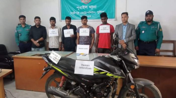 নিজস্ব প্রতিবেদক : গাজীপুর মহানগরীর পুবাইল থানা ৪০ নং ওয়ার্ডে গত ২৫ শে জানুয়ারি মেঘডুবি মৃত হাজী বিল্লালের জামাতার বাড়িতে চুরি হয়, চুরি হওয়া জিনিসগুলোর মধ্যে একটি মোটরসাইকেল ও কয়েকটি মোবাইল ফোন চুরি করে নিয়ে যায় । পরবর্তীতে বাড়ির মালিক পুবাইল থানায় অভিযোগ করলে তদন্ত কর্মকর্তা এস আই উত্তম কুমার সূত্রধর ও তার সঙ্গীও অফিসার এস আই হুমায়ুন কবির তদন্ত সাপেক্ষে পর্যায়ক্রমে চারচোরকে আটক করার পর তাদের কাছ থেকে একটি মোটরসাইকেল লিভো ১১০সিসি যার রেজি নং ঢাকা মেট্রো হ -৩০-৭৪৭৩, একটি রিয়াল মি-৮ ফোন,একটি অপ্পো-এ ১৭ কে ফোন । মালামাল সহ যাহার আনুমানিক মূল্য ( এক লক্ষ ছিয়ানব্বই হাজার আট শত টাকা) মাত্র টাকা চুরি করে নিয়ে যায়। গ্রেপ্তার চোরচক্রের সদস্যরা হলেন-(১) রুবেল ভূঁইয়া পিতা মৃত আব্দুল সাত্তার ভূঁইয়া কুদাব পূবাইল গাজীপুর মহানগর (২) উজ্জল মিয়া পিতা আবুল হোসেন সাং-২-খোলাবাড়ি থানা ও জেলা সিরাজগঞ্জ এ/পি কোনাবাড়ী গাজীপুর মহানগর (৩) মুসলিম পিতা আবেদ আলী মন্ডল সাং ফুলকারচর থানা ইসলামপুর জেলা জামালপুর এ/পি বাসন গাজীপুর মহানগর (৪) সজীব পিতা আব্বাস আলী সাং ফুলকার চর জেলা জামালপুর এ/পি বাসন গাজীপুর মহানগর । উক্ত ঘটনা সংক্রান্তে পূবাইল থানার মামলা নং -০৯(০২)২৪ । পূবাইল থানার অফিসার ইনচার্জ মোঃকামরুজ্জামান বলেন চারজন চোর আইনানুগ কার্যক্রম শেষে বিজ্ঞ আদালতে প্রেরণ করা হয়।