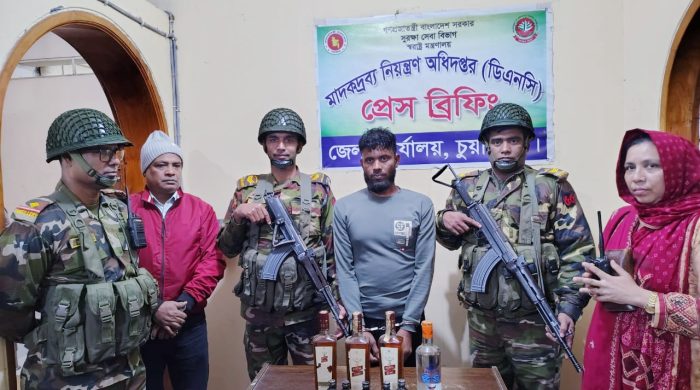 নিজস্ব প্রতিবেদক : চুয়াডাঙ্গায় যৌথ বাহিনী অভিযান চালিয়ে ৪ বোতল বিদেশী মদ ও ৫ বোতল ফেন্সিডিল সহ এক মাদক কারবারিকে আটক করেছে। সোমবার ৯ ডিসেম্বর বেলা সাড়ে ১১ ঘটিকায় সময়