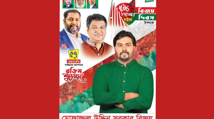 নিজস্ব প্রতিবেদক : ১৬ই ডিসেম্বর মহান বিজয় দিবস উপলক্ষে টঙ্গী পূর্ব থানা যুবদল নেতা ও ৫৭ নং ওয়ার্ডের কাউন্সিলর পদপ্রার্থী মোফাজ্জল উদ্দিন সরকার বিজয় দেশবাসীকে আন্তরিক শুভেচ্ছা ও অভিনন্দন জানিয়েছেন।