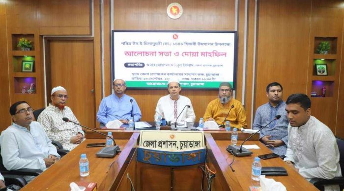 মাহমুদ হাসান রনি, চুয়াডাঙ্গা (দর্শনা) প্রতিনিধিঃ চুয়াডাঙ্গায় জেলা প্রশাসকের উদ্যোগে পবিত্র ঈদ-ই-মিলাদুন্নবী উদযাপন উপলক্ষে আলোচনা সভা ও দোয়া মাহফিল অনুষ্ঠিত হয়েছে। সোমবার বেলা ১১ টায় চুয়াডাঙ্গা জেলা প্রশাসকের সম্মেলন কক্ষে