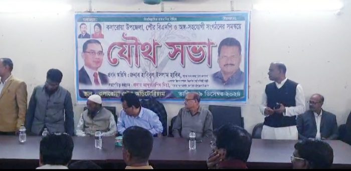 কলারোয়া (সাতক্ষীরা) প্রতিনিধি : কলারোয়া উপজেলা পৌর বিএনপি অঙ্গ সহযোগী সংগঠনের সমন্বয়ে যৌথ সভা অনুষ্ঠিত হয়। তার আগে সাবেক এমপি হাবিবুল ইসলাম হাবিবের বাসভবনের সামনে থেকে একটি বিশাল রেলি মিছিল