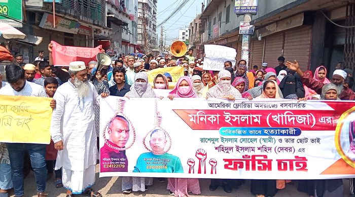 নিজস্ব প্রতিবেদক : আমেরিকা ফ্লোরিডা অঙ্গরাজ্যে বসবাসরত মনিকা ইসলাম (খাদিজা’র) পরিকল্পিত ভাবে হত্যাকারী রাশেদুল ইসলাম সোহেল (স্বামী) ও তার ছোট ভাই শহিদুল ইসলাম শহিদ (দেবর) এর ফাঁসির দাবিতে টঙ্গীতে বিক্ষোভ